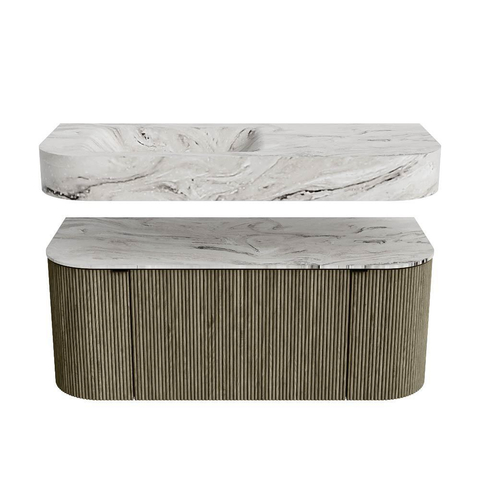 Boven het meubel zweeft een bijpassende, vrij hangende wastafel met afgeronde hoeken – perfect afgestemd op de vorm van de kast. De wastafel is uitgevoerd in Solid Surface en volgt subtiel de lijnen van het onderliggende meubel, waardoor een harmonieus geheel ontstaat. Het Solid Surface topblad vormt een sterke, onderhoudsvriendelijke basis en maakt de combinatie compleet.