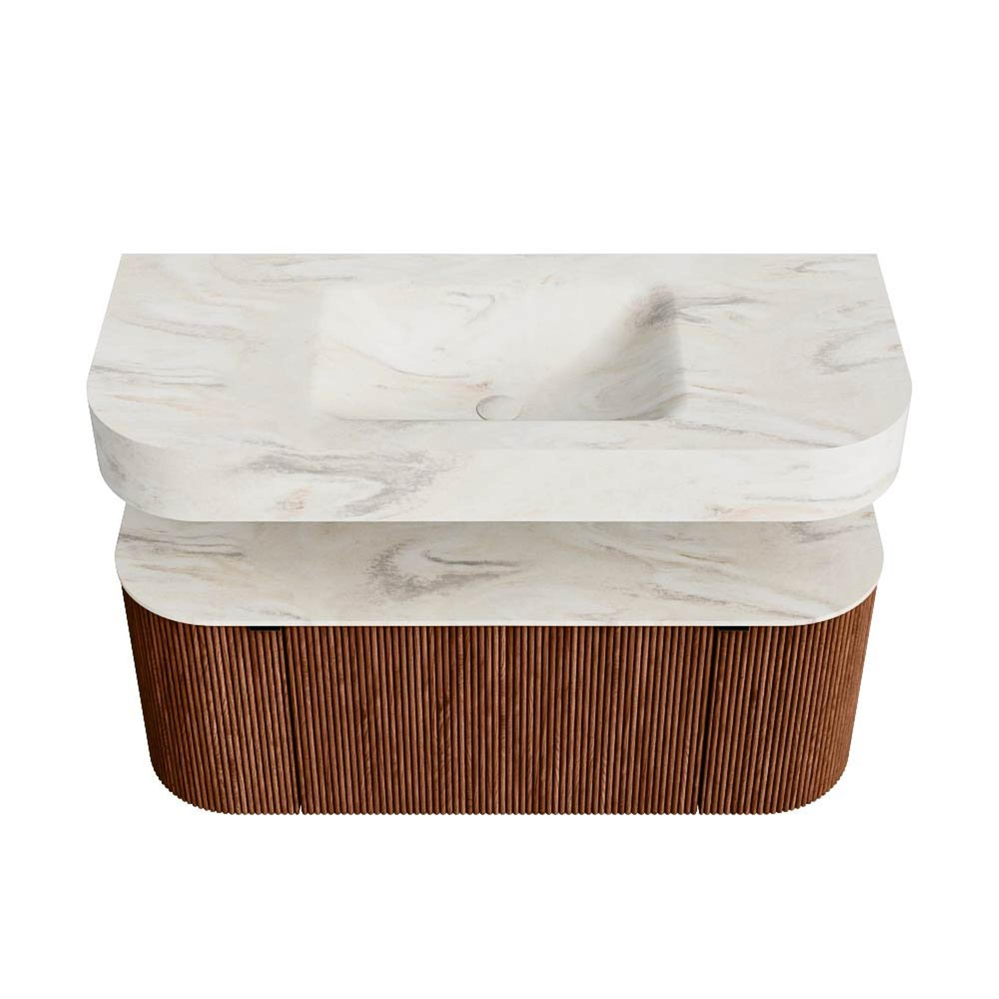 MONDIAZ THOR-DLUX 110cm badmeubel ronding links + rechts kleur Ruby met 1 lade en 2 deuren. Vrijhangende wastafel CLOUD Midden zonder kraangat kleur Ostra.
