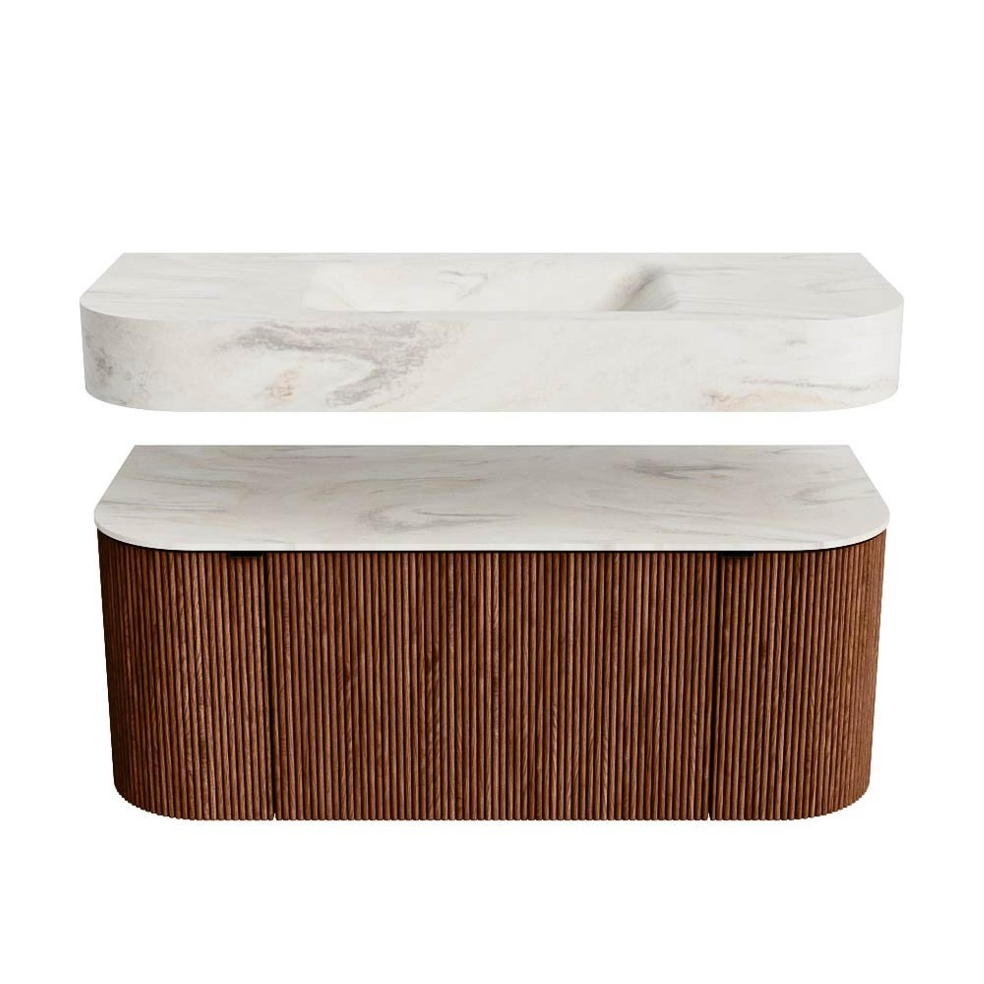 Boven het meubel zweeft een bijpassende, vrij hangende wastafel met afgeronde hoeken – perfect afgestemd op de vorm van de kast. De wastafel is uitgevoerd in Solid Surface en volgt subtiel de lijnen van het onderliggende meubel, waardoor een harmonieus geheel ontstaat. Het Solid Surface topblad vormt een sterke, onderhoudsvriendelijke basis en maakt de combinatie compleet.