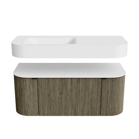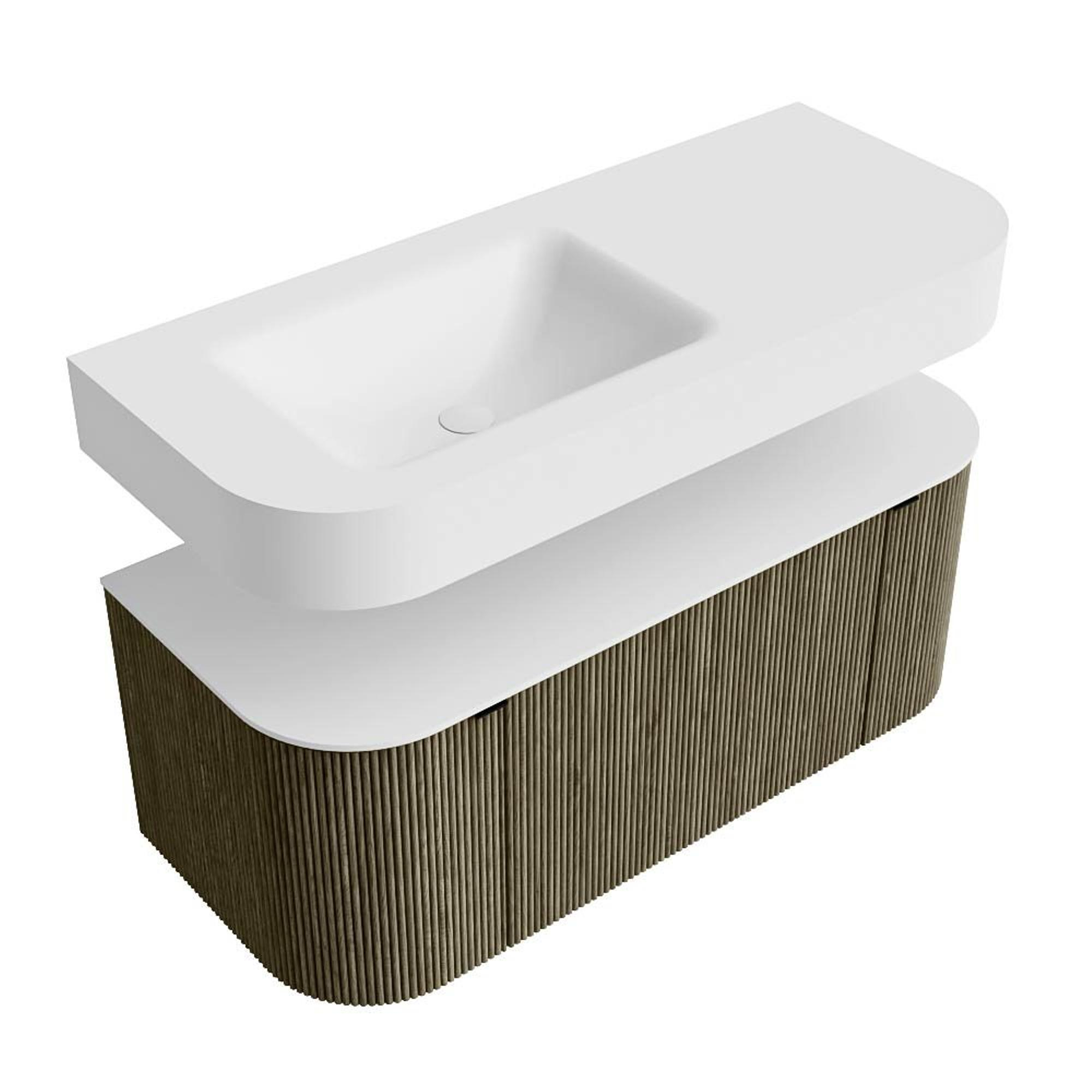 Boven het meubel zweeft een bijpassende, vrij hangende wastafel met afgeronde hoeken – perfect afgestemd op de vorm van de kast. De wastafel is uitgevoerd in Solid Surface en volgt subtiel de lijnen van het onderliggende meubel, waardoor een harmonieus geheel ontstaat. Het Solid Surface topblad vormt een sterke, onderhoudsvriendelijke basis en maakt de combinatie compleet.