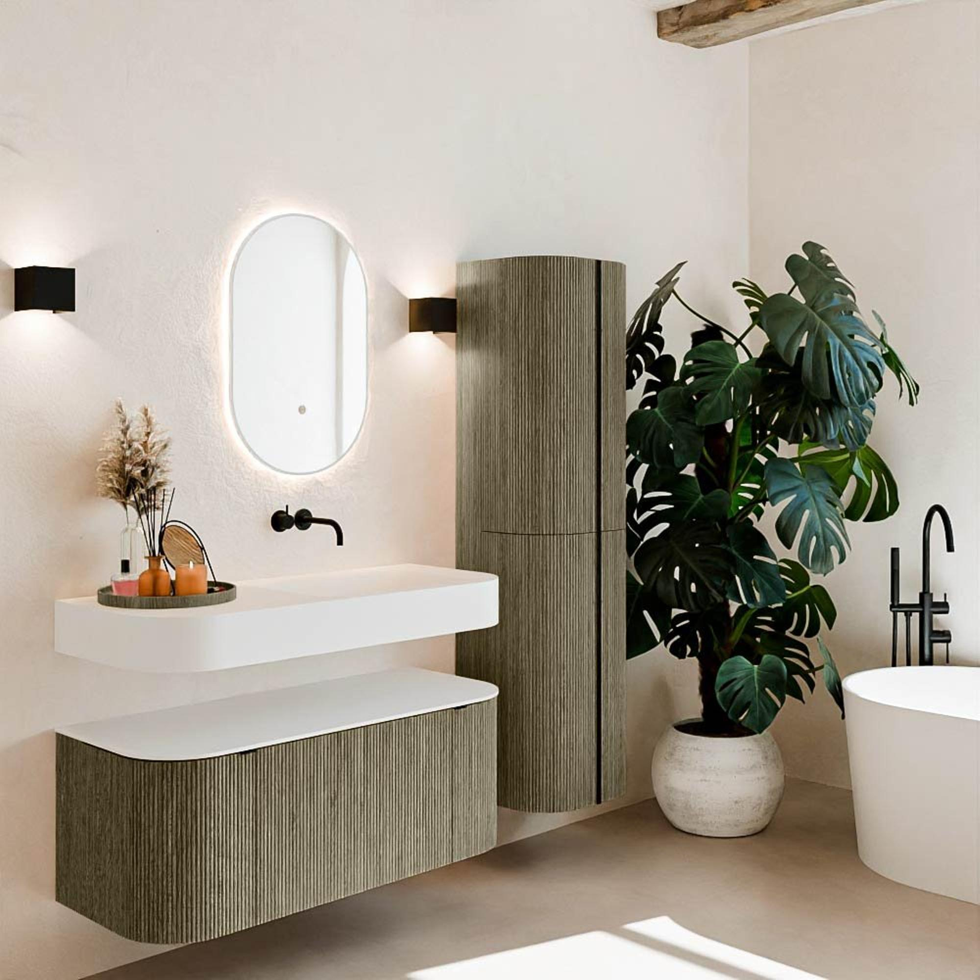 Natuurlijke materialen in warme tinten. De verticale ribbels brengen ritme en textuur in het ontwerp, terwijl het eikenhout zorgt voor een warme, ambachtelijke uitstraling. Kies uit 5 houttinten OAK, WALNUT, DUSK, SHADOW en RUBY zorgvuldig geselecteerde houtkleuren om zowel moderne als klassieke badkamers te verrijken.
