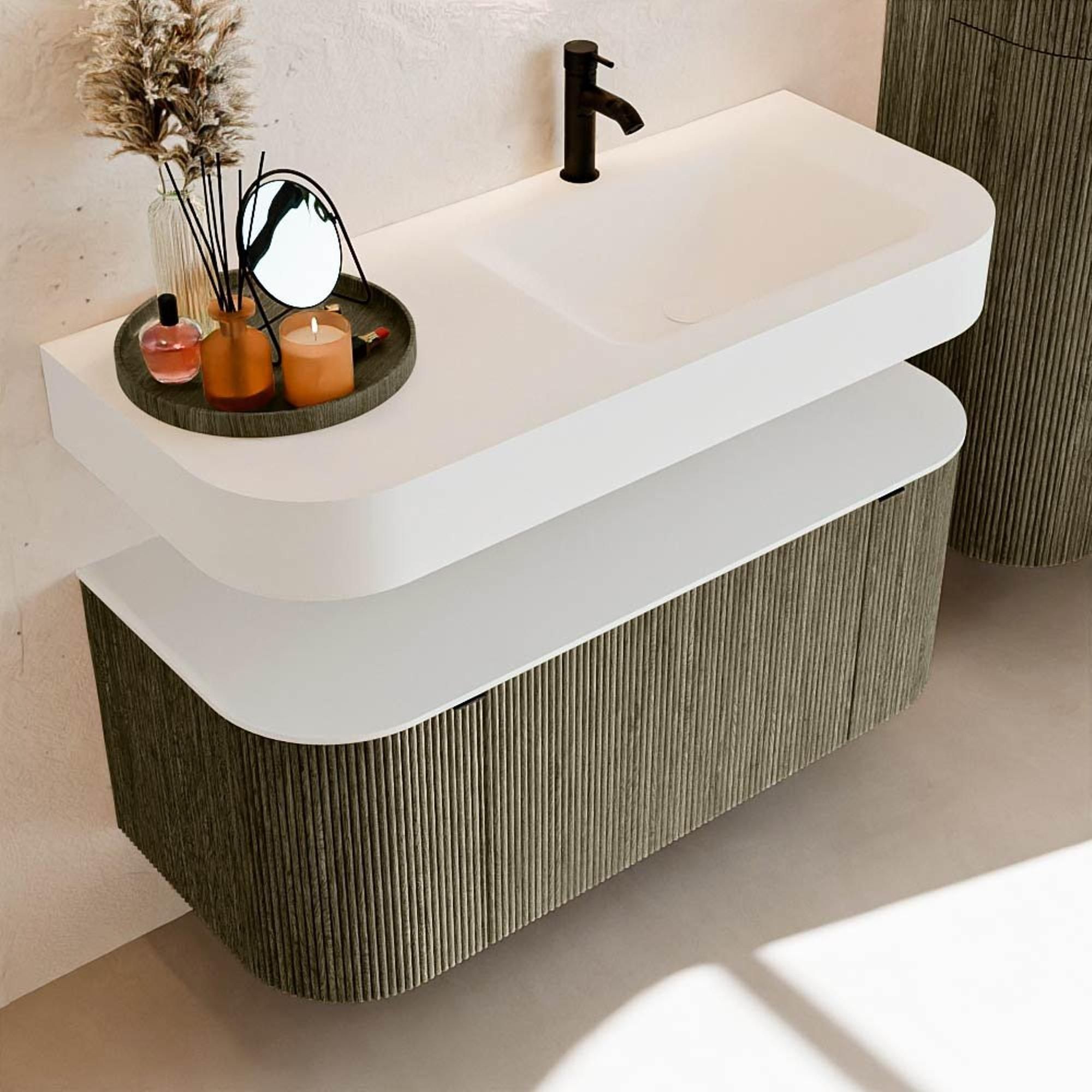 Boven het meubel zweeft een bijpassende, vrij hangende wastafel met afgeronde hoeken – perfect afgestemd op de vorm van de kast. De wastafel is uitgevoerd in Solid Surface en volgt subtiel de lijnen van het onderliggende meubel, waardoor een harmonieus geheel ontstaat. Het Solid Surface topblad vormt een sterke, onderhoudsvriendelijke basis en maakt de combinatie compleet.