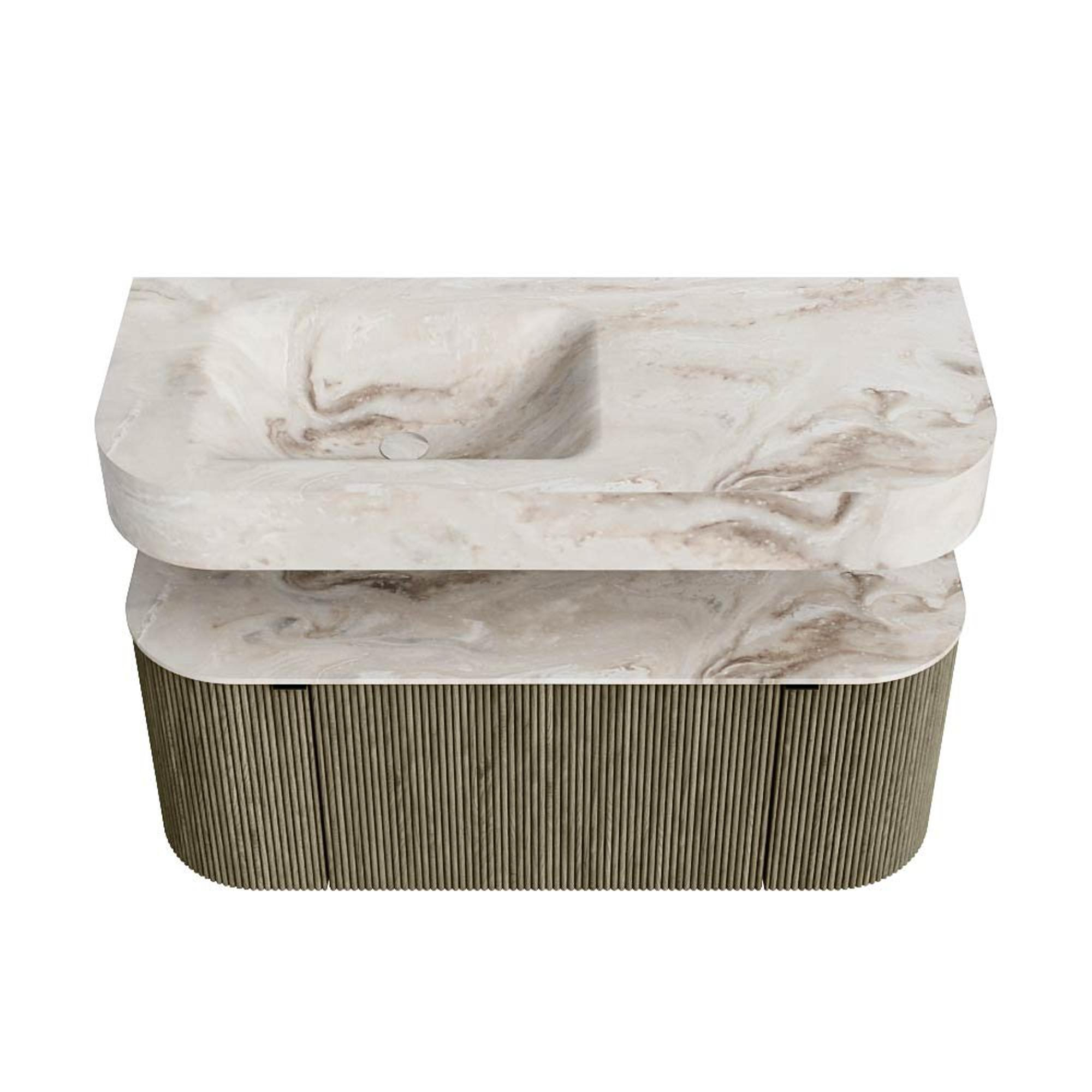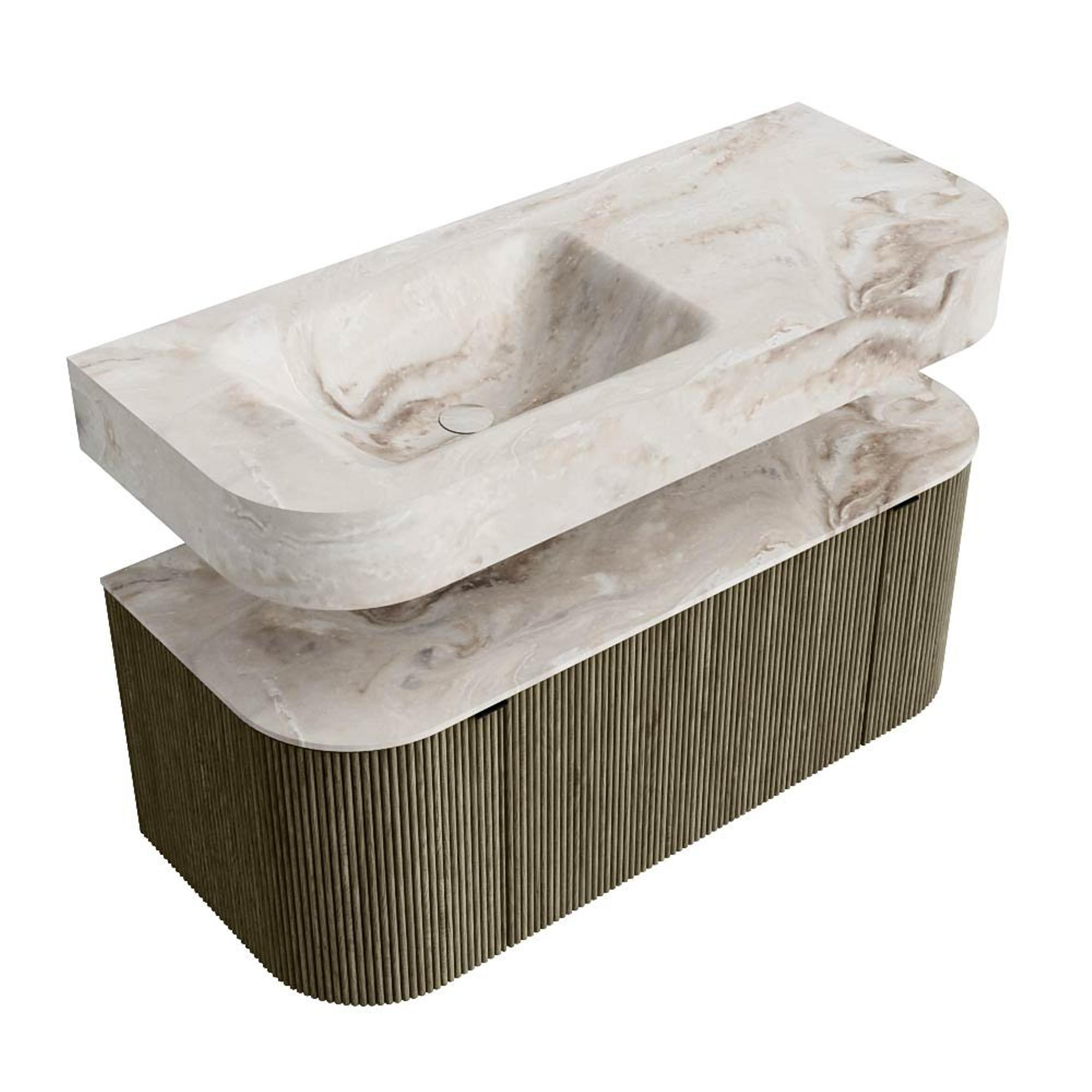 MONDIAZ THOR-DLUX 110cm badmeubel ronding links + rechts kleur Shadow met 1 lade en 2 deuren. Vrijhangende wastafel CLOUD Links zonder kraangat kleur Frappe.