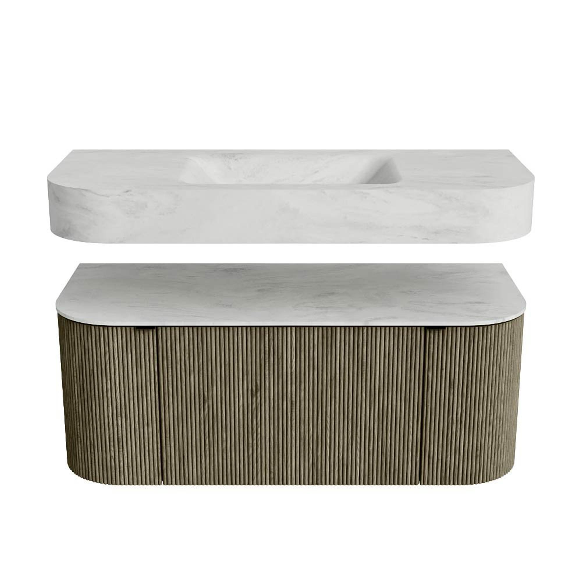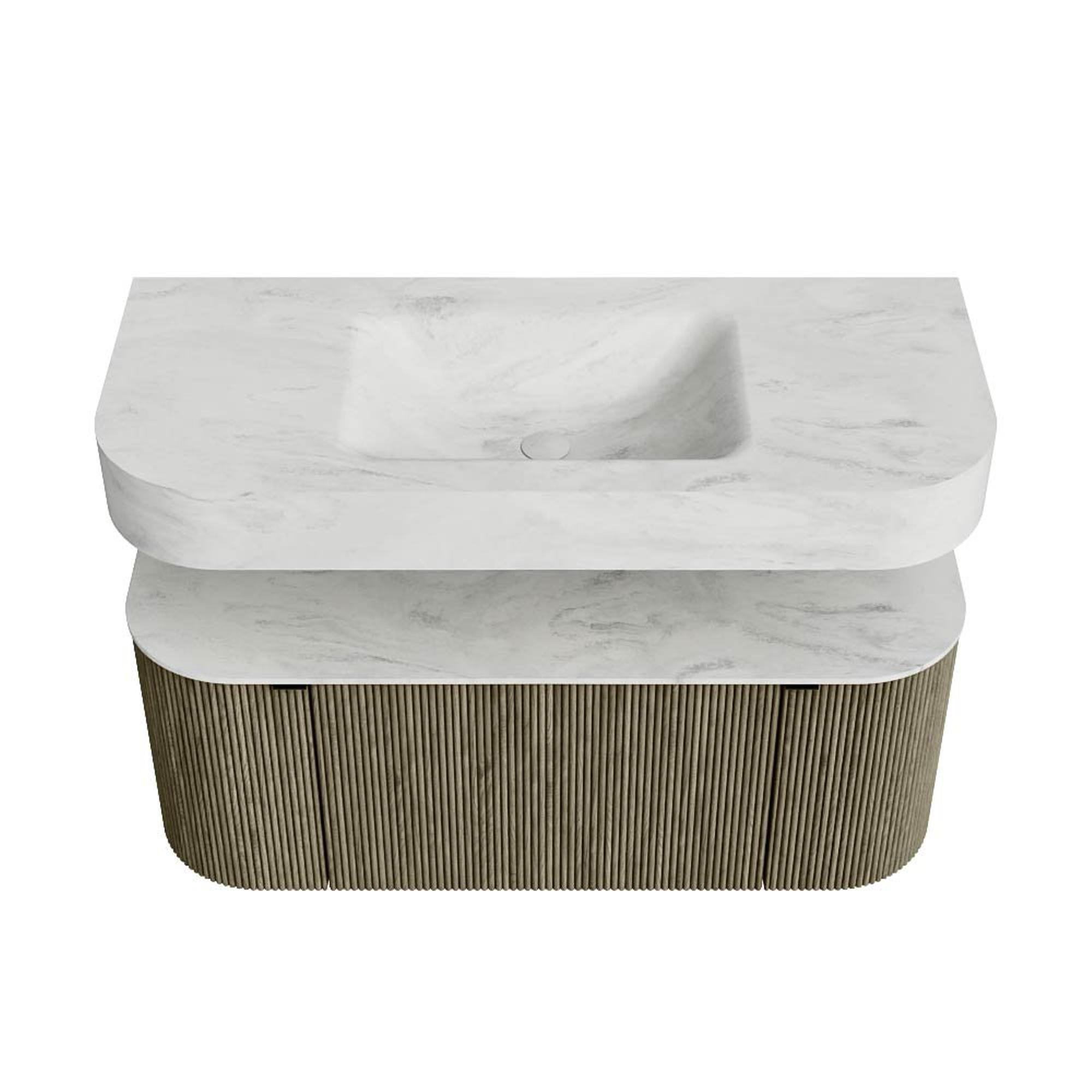 Boven het meubel zweeft een bijpassende, vrij hangende wastafel met afgeronde hoeken – perfect afgestemd op de vorm van de kast. De wastafel is uitgevoerd in Solid Surface en volgt subtiel de lijnen van het onderliggende meubel, waardoor een harmonieus geheel ontstaat. Het Solid Surface topblad vormt een sterke, onderhoudsvriendelijke basis en maakt de combinatie compleet.