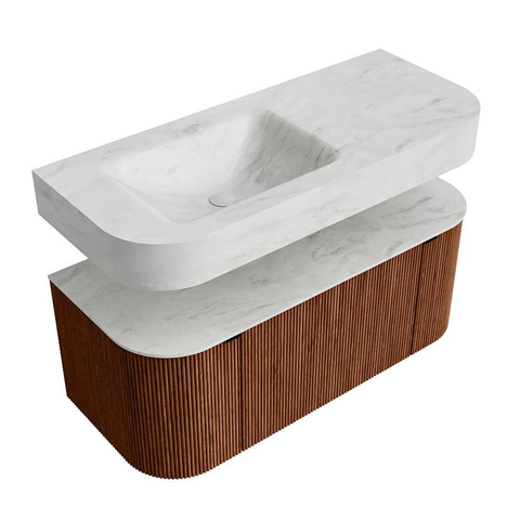MONDIAZ THOR-DLUX 110cm badmeubel ronding links + rechts kleur Ruby met 1 lade en 2 deuren. Vrijhangende wastafel CLOUD Links zonder kraangat kleur Opalo.