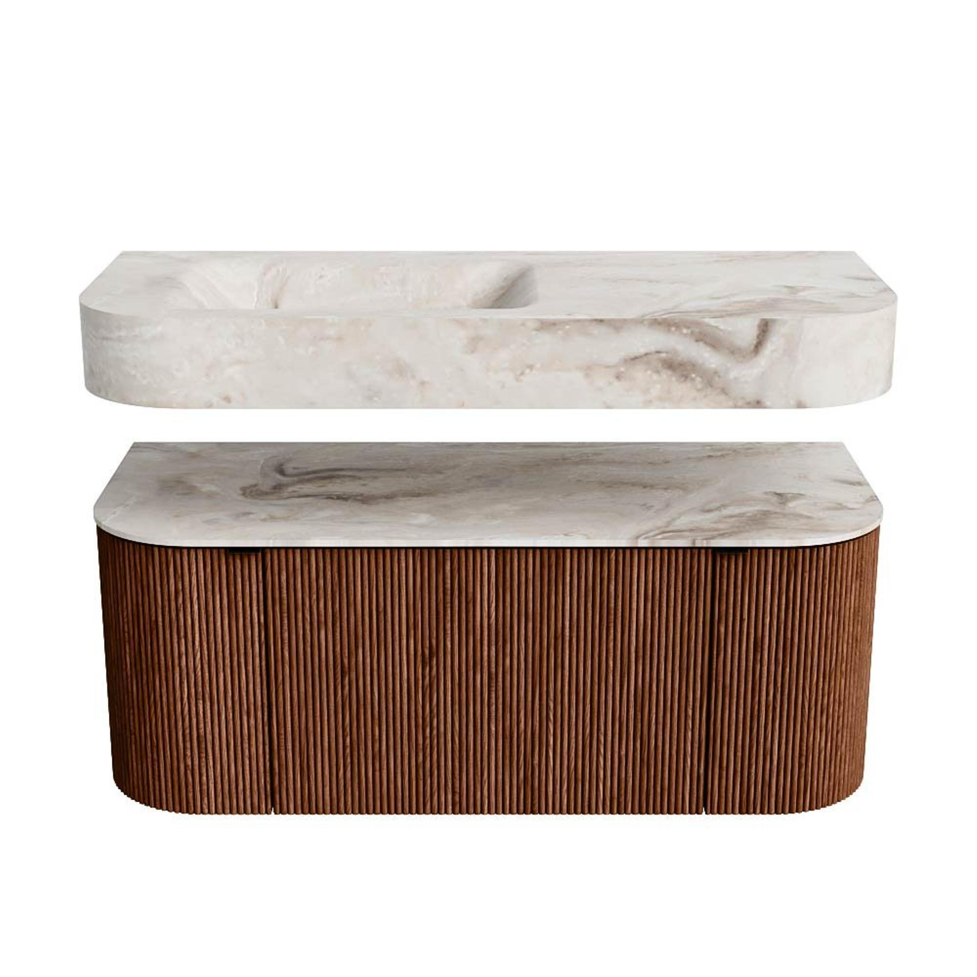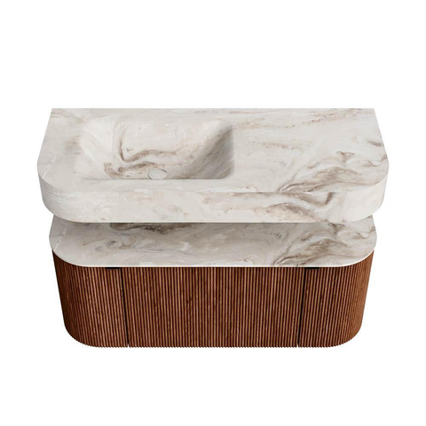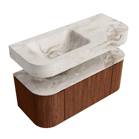 MONDIAZ THOR-DLUX 110cm badmeubel ronding links + rechts kleur Ruby met 1 lade en 2 deuren. Vrijhangende wastafel CLOUD Links zonder kraangat kleur Frappe.