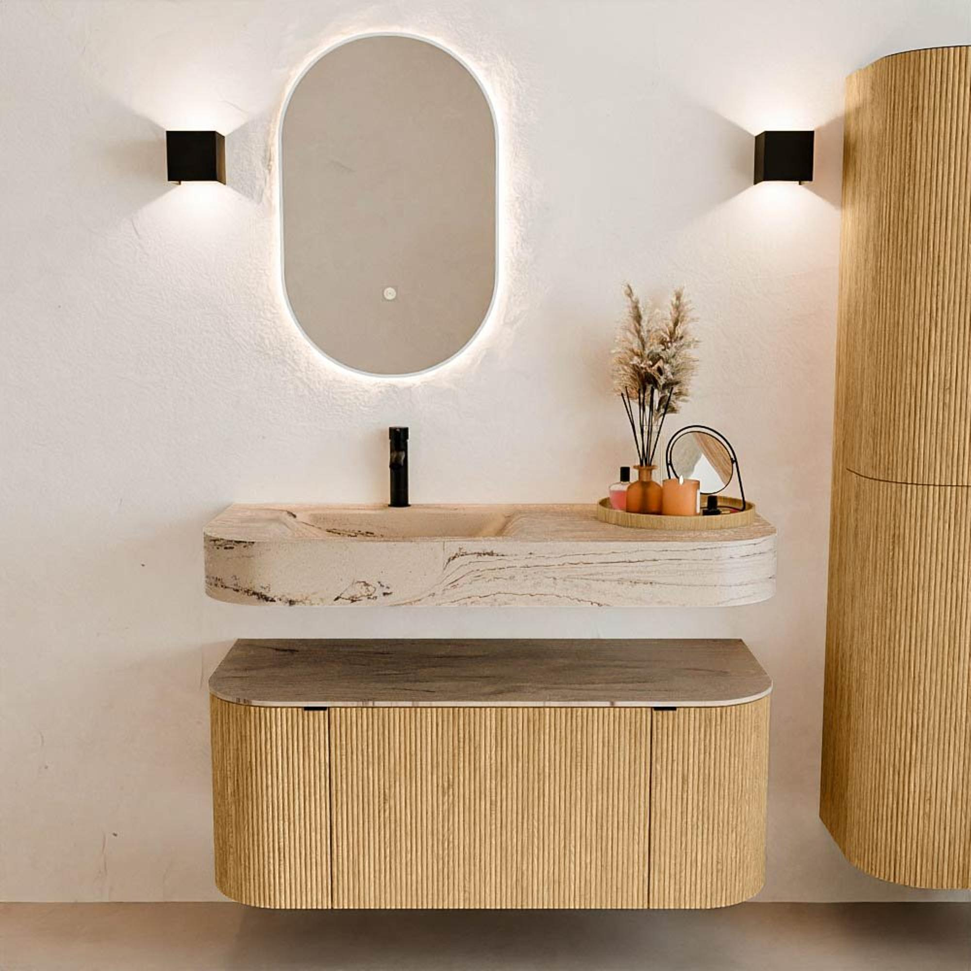 Natuurlijke materialen in warme tinten. De verticale ribbels brengen ritme en textuur in het ontwerp, terwijl het eikenhout zorgt voor een warme, ambachtelijke uitstraling. Kies uit 5 houttinten OAK, WALNUT, DUSK, SHADOW en RUBY zorgvuldig geselecteerde houtkleuren om zowel moderne als klassieke badkamers te verrijken.
