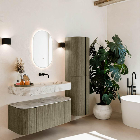 Natuurlijke materialen in warme tinten. De verticale ribbels brengen ritme en textuur in het ontwerp, terwijl het eikenhout zorgt voor een warme, ambachtelijke uitstraling. Kies uit 5 houttinten OAK, WALNUT, DUSK, SHADOW en RUBY zorgvuldig geselecteerde houtkleuren om zowel moderne als klassieke badkamers te verrijken.