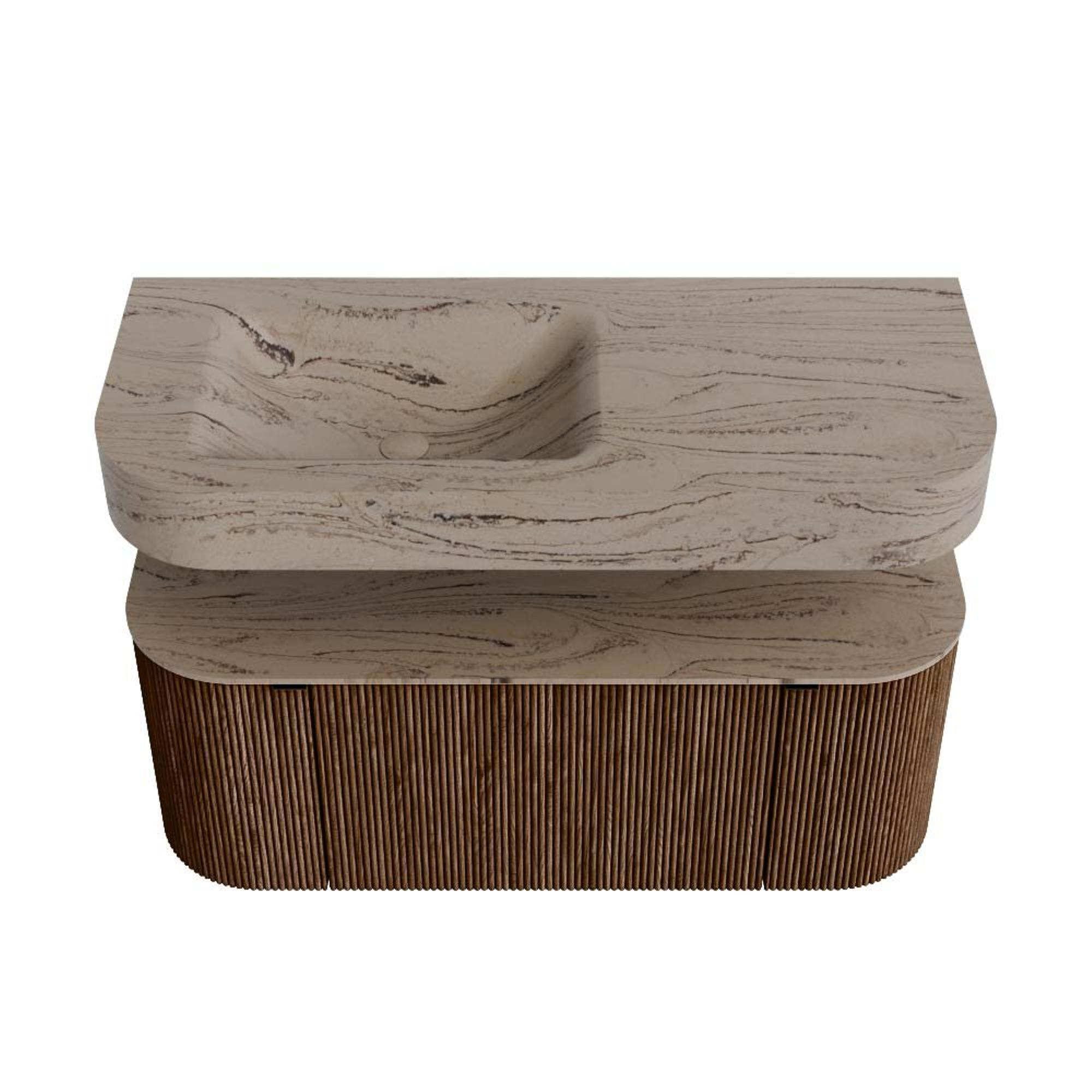 MONDIAZ THOR-DLUX 110cm badmeubel ronding links + rechts kleur Walnut met 1 lade en 2 deuren. Vrijhangende wastafel CLOUD Links zonder kraangat kleur Arena.