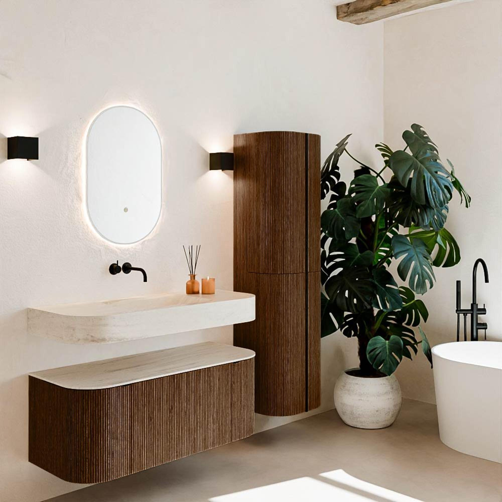 Natuurlijke materialen in warme tinten. De verticale ribbels brengen ritme en textuur in het ontwerp, terwijl het eikenhout zorgt voor een warme, ambachtelijke uitstraling. Kies uit 5 houttinten OAK, WALNUT, DUSK, SHADOW en RUBY zorgvuldig geselecteerde houtkleuren om zowel moderne als klassieke badkamers te verrijken.