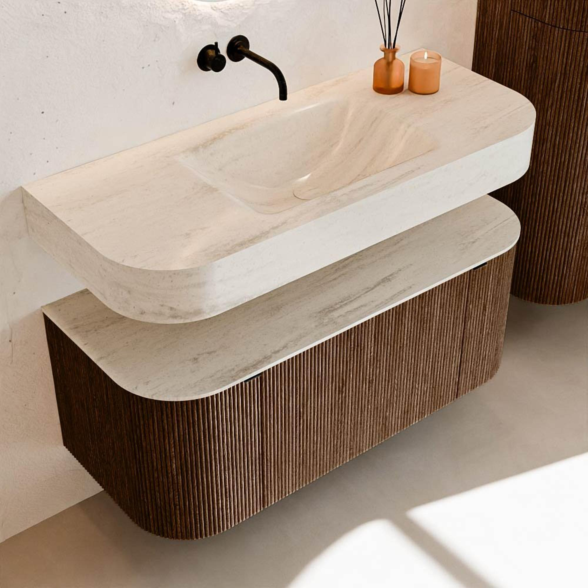 MONDIAZ THOR-DLUX 110cm badmeubel ronding links + rechts kleur Walnut met 1 lade en 2 deuren. Vrijhangende wastafel CLOUD Midden zonder kraangat kleur Meli.