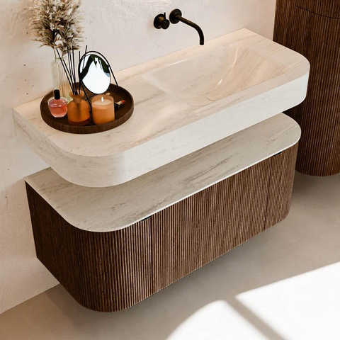 MONDIAZ THOR-DLUX 110cm badmeubel ronding links + rechts kleur Walnut met 1 lade en 2 deuren. Vrijhangende wastafel CLOUD Rechts zonder kraangat kleur Meli.