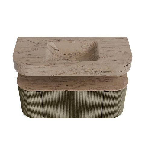 Boven het meubel zweeft een bijpassende, vrij hangende wastafel met afgeronde hoeken – perfect afgestemd op de vorm van de kast. De wastafel is uitgevoerd in Solid Surface en volgt subtiel de lijnen van het onderliggende meubel, waardoor een harmonieus geheel ontstaat. Het Solid Surface topblad vormt een sterke, onderhoudsvriendelijke basis en maakt de combinatie compleet.
