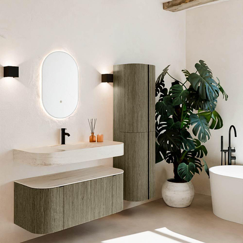 Natuurlijke materialen in warme tinten. De verticale ribbels brengen ritme en textuur in het ontwerp, terwijl het eikenhout zorgt voor een warme, ambachtelijke uitstraling. Kies uit 5 houttinten OAK, WALNUT, DUSK, SHADOW en RUBY zorgvuldig geselecteerde houtkleuren om zowel moderne als klassieke badkamers te verrijken.