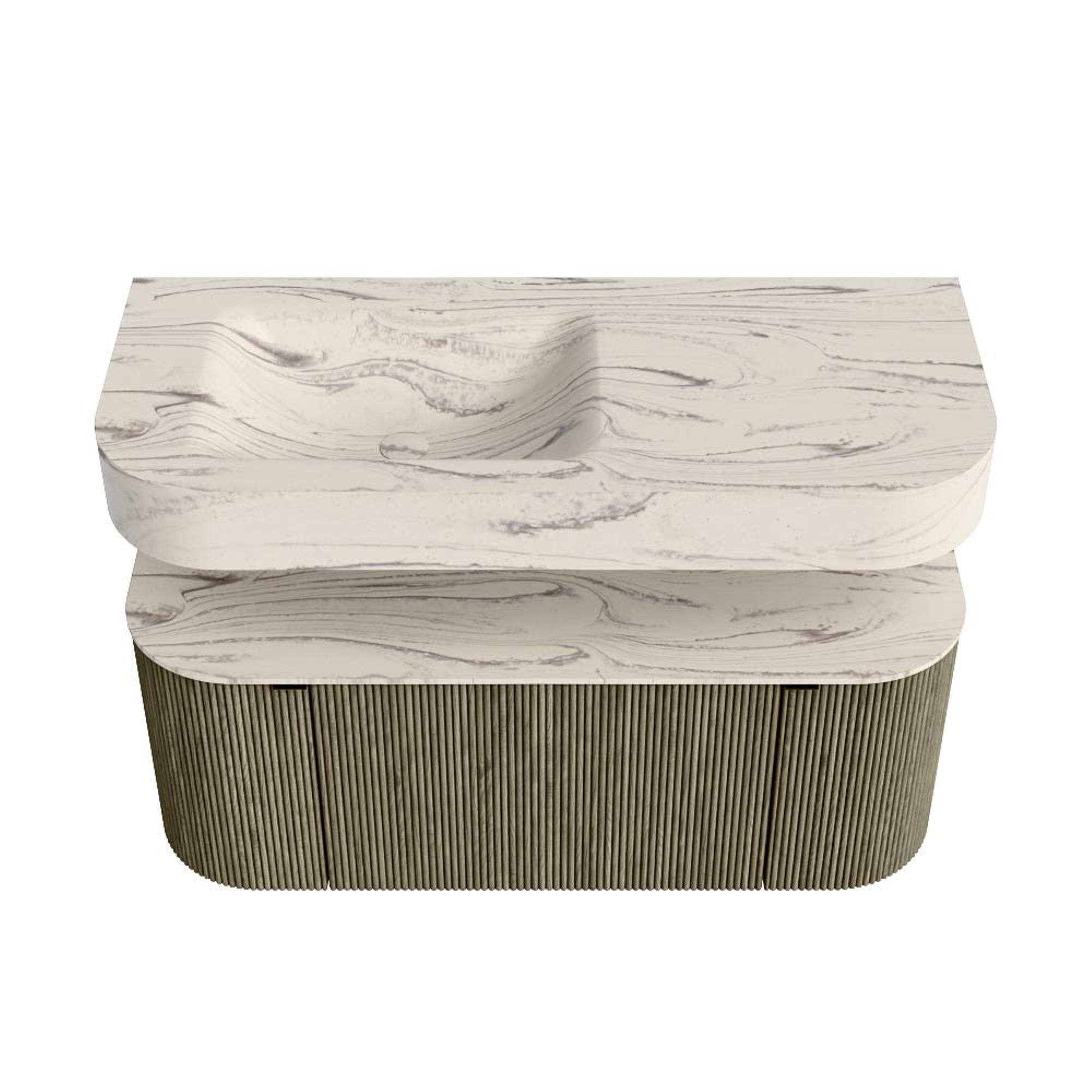 Boven het meubel zweeft een bijpassende, vrij hangende wastafel met afgeronde hoeken – perfect afgestemd op de vorm van de kast. De wastafel is uitgevoerd in Solid Surface en volgt subtiel de lijnen van het onderliggende meubel, waardoor een harmonieus geheel ontstaat. Het Solid Surface topblad vormt een sterke, onderhoudsvriendelijke basis en maakt de combinatie compleet.