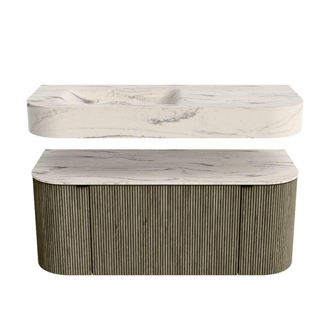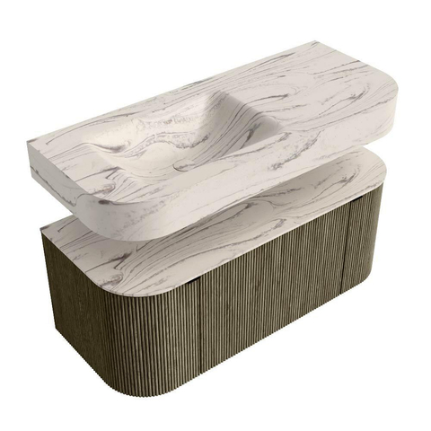 MONDIAZ THOR-DLUX 110cm badmeubel ronding links + rechts kleur Shadow met 1 lade en 2 deuren. Vrijhangende wastafel CLOUD Links zonder kraangat kleur Nata.