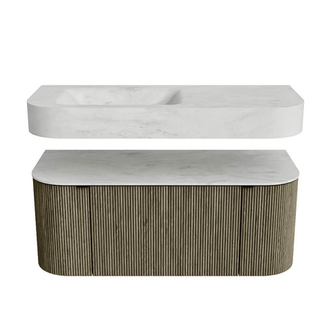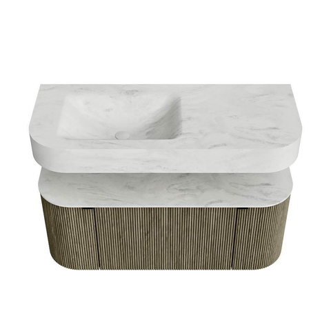 Boven het meubel zweeft een bijpassende, vrij hangende wastafel met afgeronde hoeken – perfect afgestemd op de vorm van de kast. De wastafel is uitgevoerd in Solid Surface en volgt subtiel de lijnen van het onderliggende meubel, waardoor een harmonieus geheel ontstaat. Het Solid Surface topblad vormt een sterke, onderhoudsvriendelijke basis en maakt de combinatie compleet.