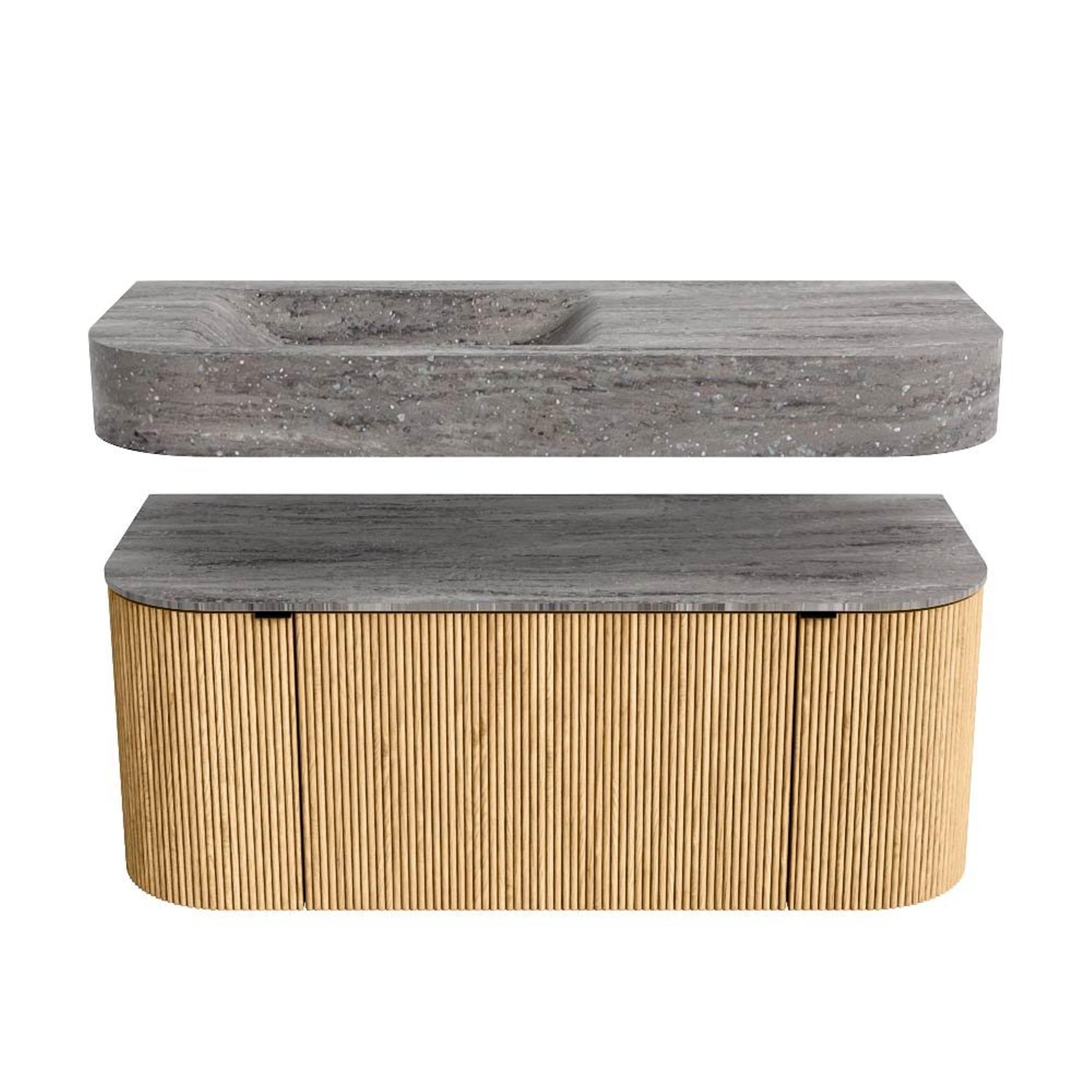 Boven het meubel zweeft een bijpassende, vrij hangende wastafel met afgeronde hoeken – perfect afgestemd op de vorm van de kast. De wastafel is uitgevoerd in Solid Surface en volgt subtiel de lijnen van het onderliggende meubel, waardoor een harmonieus geheel ontstaat. Het Solid Surface topblad vormt een sterke, onderhoudsvriendelijke basis en maakt de combinatie compleet.