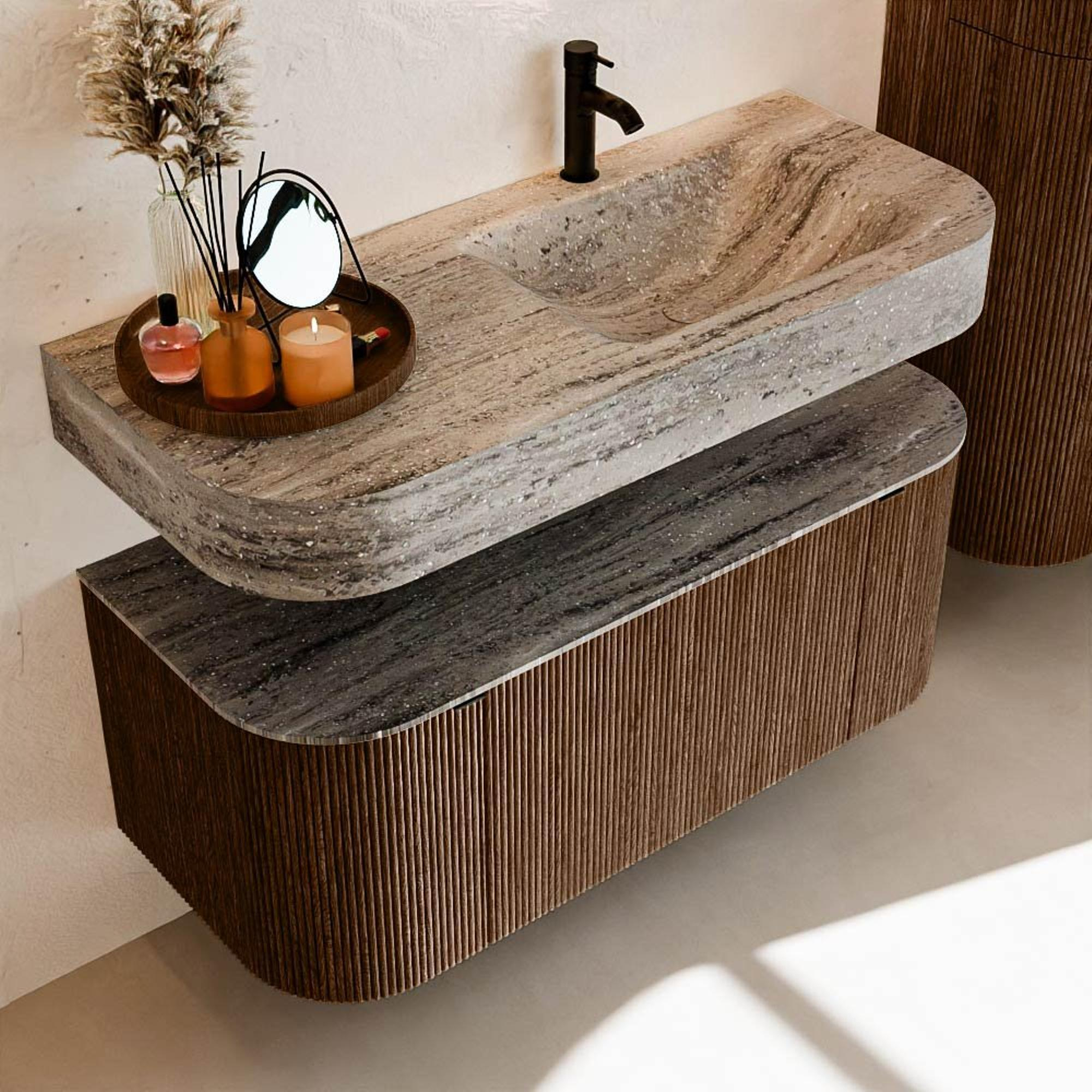 MONDIAZ THOR-DLUX 110cm badmeubel ronding links + rechts kleur Walnut met 1 lade en 2 deuren. Vrijhangende wastafel CLOUD Rechts 1 kraangat kleur Oza.