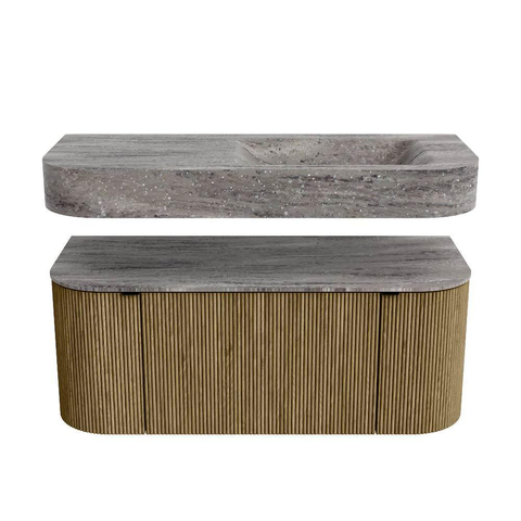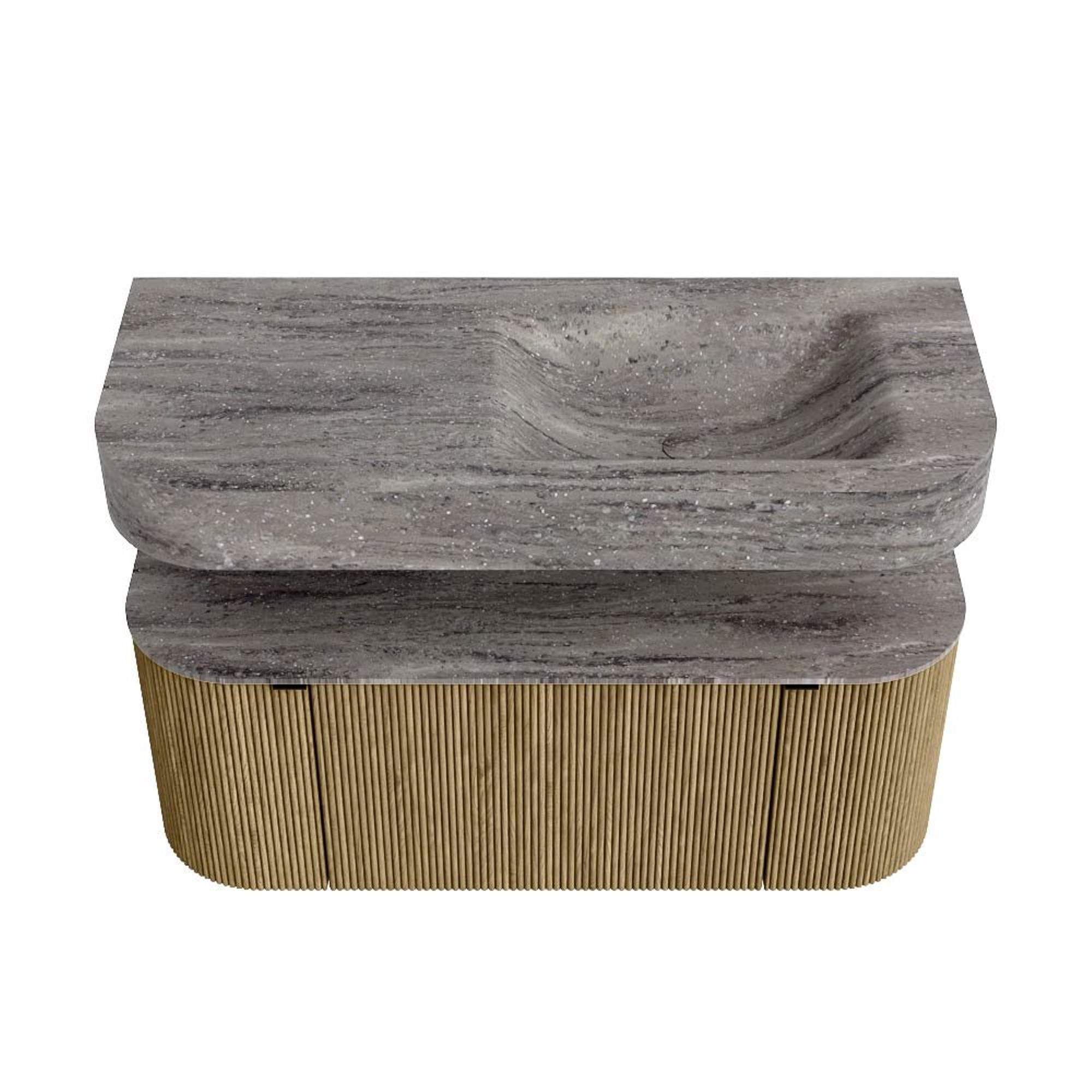 MONDIAZ THOR-DLUX 110cm badmeubel ronding links + rechts kleur Dusk met 1 lade en 2 deuren. Vrijhangende wastafel CLOUD Rechts zonder kraangat kleur Oza.