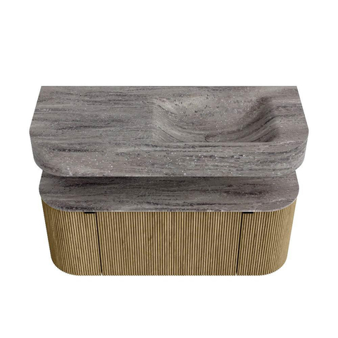 Boven het meubel zweeft een bijpassende, vrij hangende wastafel met afgeronde hoeken – perfect afgestemd op de vorm van de kast. De wastafel is uitgevoerd in Solid Surface en volgt subtiel de lijnen van het onderliggende meubel, waardoor een harmonieus geheel ontstaat. Het Solid Surface topblad vormt een sterke, onderhoudsvriendelijke basis en maakt de combinatie compleet.