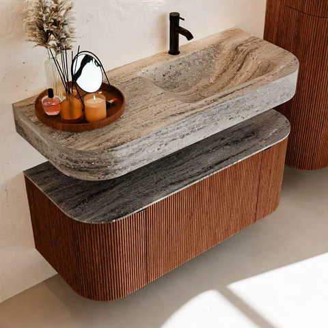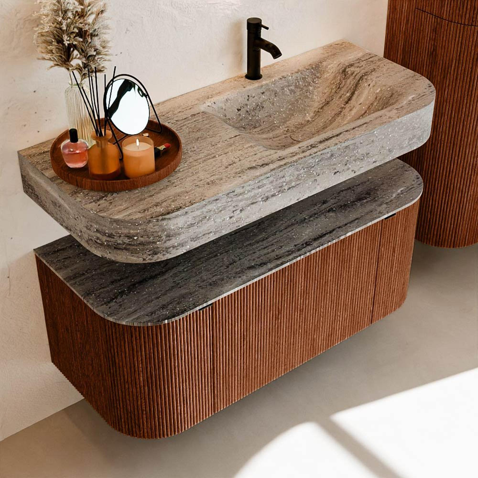 MONDIAZ THOR-DLUX 110cm badmeubel ronding links + rechts kleur Ruby met 1 lade en 2 deuren. Vrijhangende wastafel CLOUD Rechts 1 kraangat kleur Oza.
