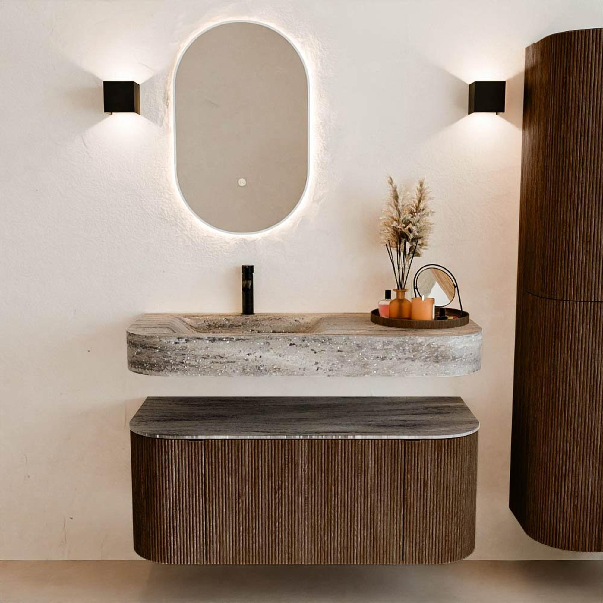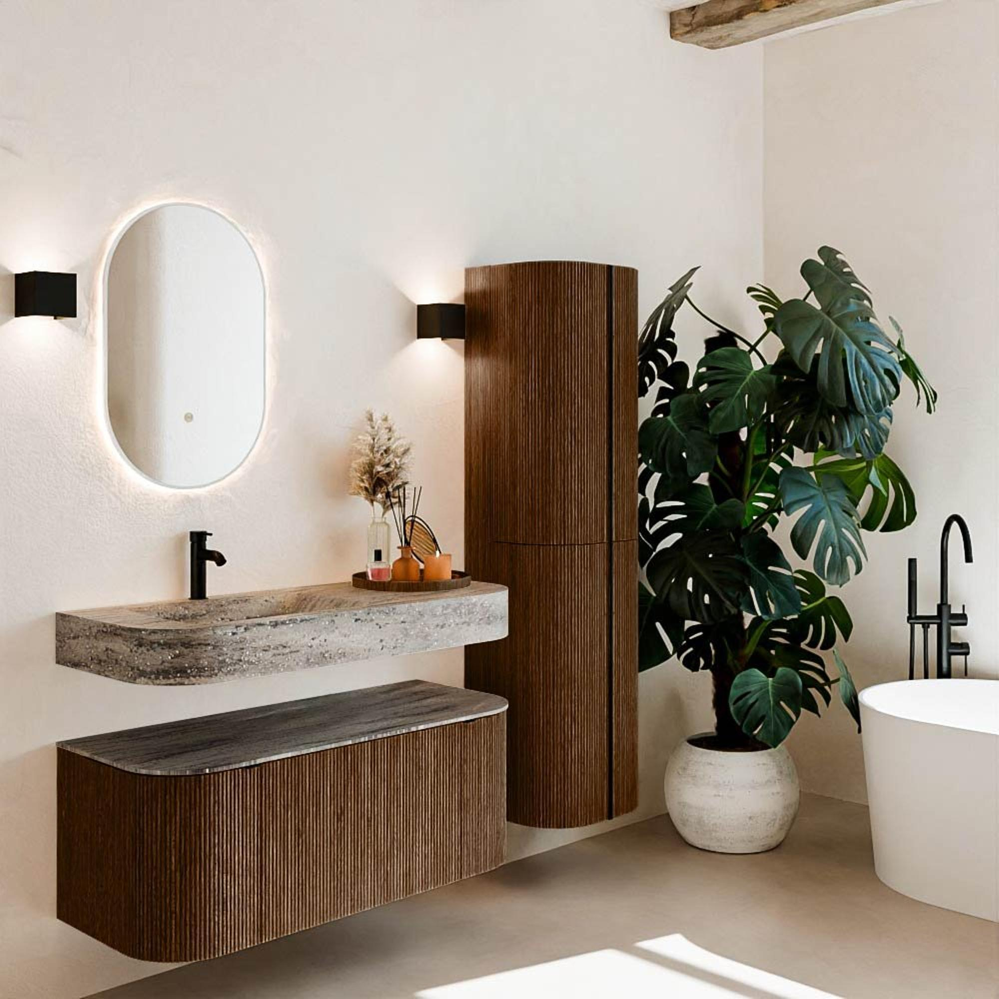 Natuurlijke materialen in warme tinten. De verticale ribbels brengen ritme en textuur in het ontwerp, terwijl het eikenhout zorgt voor een warme, ambachtelijke uitstraling. Kies uit 5 houttinten OAK, WALNUT, DUSK, SHADOW en RUBY zorgvuldig geselecteerde houtkleuren om zowel moderne als klassieke badkamers te verrijken.