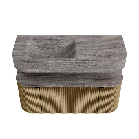 Boven het meubel zweeft een bijpassende, vrij hangende wastafel met afgeronde hoeken – perfect afgestemd op de vorm van de kast. De wastafel is uitgevoerd in Solid Surface en volgt subtiel de lijnen van het onderliggende meubel, waardoor een harmonieus geheel ontstaat. Het Solid Surface topblad vormt een sterke, onderhoudsvriendelijke basis en maakt de combinatie compleet.