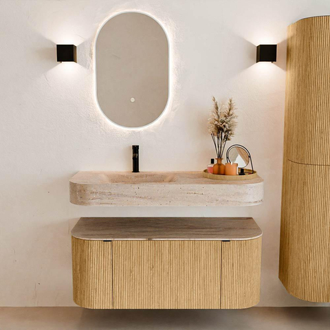 Natuurlijke materialen in warme tinten. De verticale ribbels brengen ritme en textuur in het ontwerp, terwijl het eikenhout zorgt voor een warme, ambachtelijke uitstraling. Kies uit 5 houttinten OAK, WALNUT, DUSK, SHADOW en RUBY zorgvuldig geselecteerde houtkleuren om zowel moderne als klassieke badkamers te verrijken.