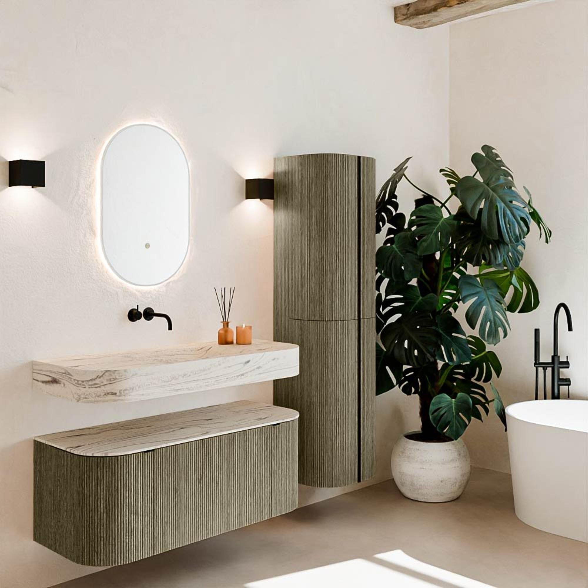 Natuurlijke materialen in warme tinten. De verticale ribbels brengen ritme en textuur in het ontwerp, terwijl het eikenhout zorgt voor een warme, ambachtelijke uitstraling. Kies uit 5 houttinten OAK, WALNUT, DUSK, SHADOW en RUBY zorgvuldig geselecteerde houtkleuren om zowel moderne als klassieke badkamers te verrijken.
