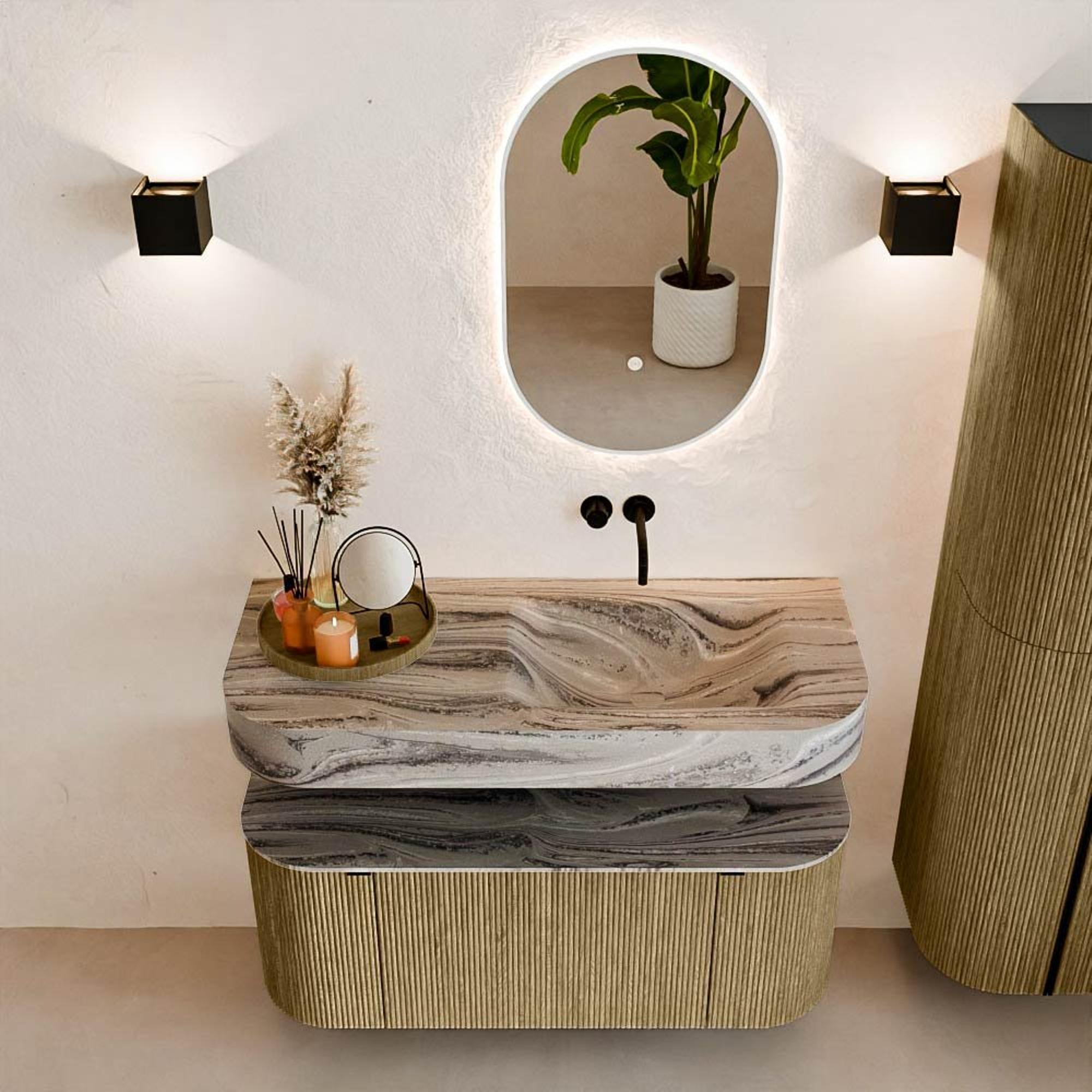 Natuurlijke materialen in warme tinten. De verticale ribbels brengen ritme en textuur in het ontwerp, terwijl het eikenhout zorgt voor een warme, ambachtelijke uitstraling. Kies uit 5 houttinten OAK, WALNUT, DUSK, SHADOW en RUBY zorgvuldig geselecteerde houtkleuren om zowel moderne als klassieke badkamers te verrijken.