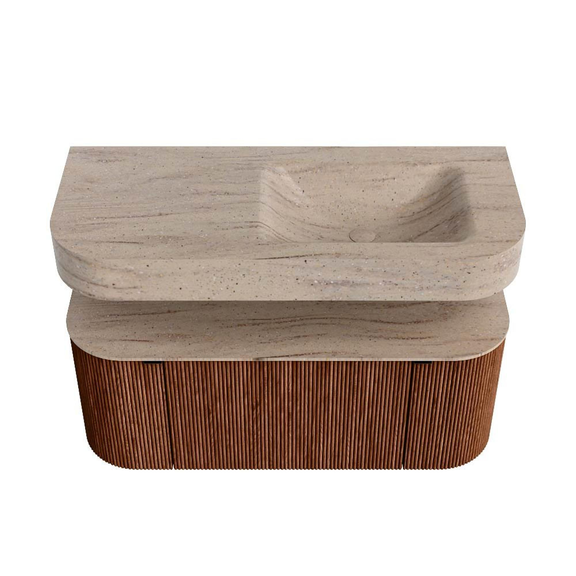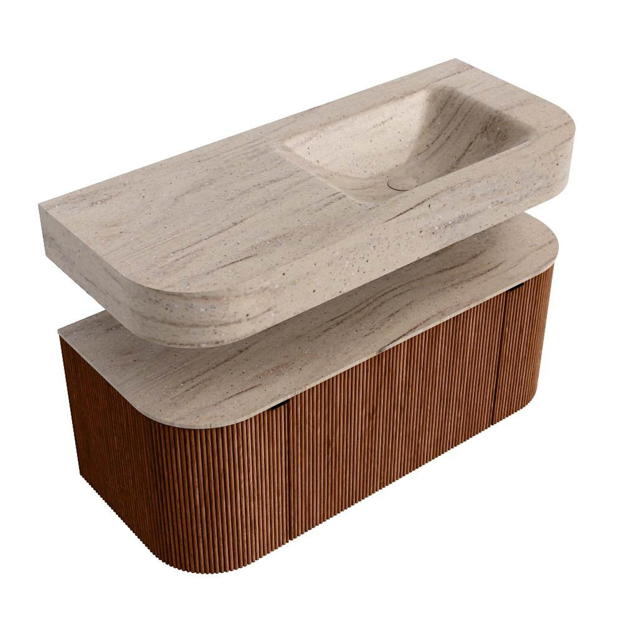 MONDIAZ THOR-DLUX 110cm badmeubel ronding links + rechts kleur Ruby met 1 lade en 2 deuren. Vrijhangende wastafel CLOUD Rechts 1 kraangat kleur Saba.