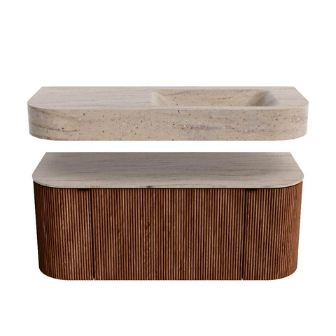 Boven het meubel zweeft een bijpassende, vrij hangende wastafel met afgeronde hoeken – perfect afgestemd op de vorm van de kast. De wastafel is uitgevoerd in Solid Surface en volgt subtiel de lijnen van het onderliggende meubel, waardoor een harmonieus geheel ontstaat. Het Solid Surface topblad vormt een sterke, onderhoudsvriendelijke basis en maakt de combinatie compleet.