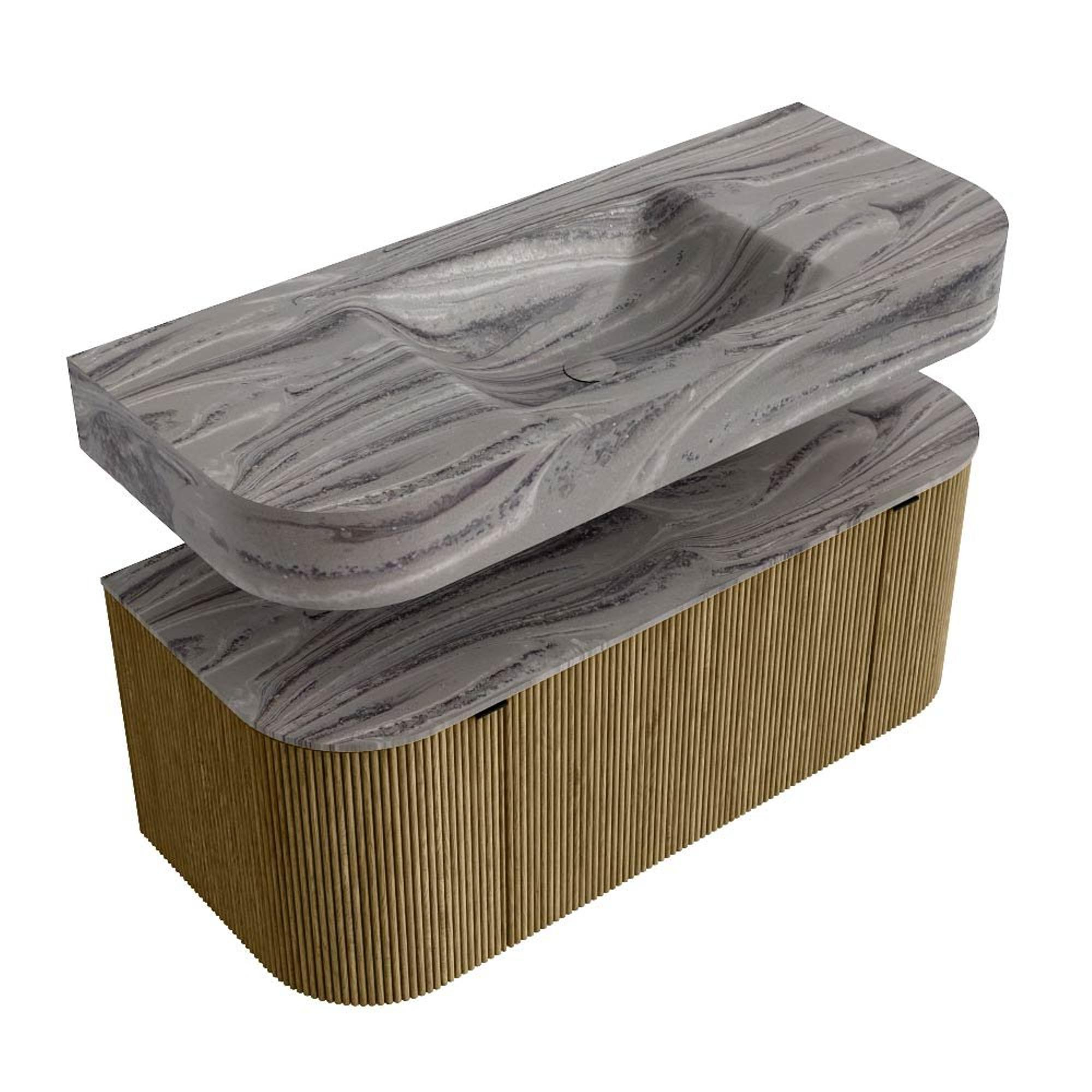 MONDIAZ THOR-DLUX 110cm badmeubel ronding links + rechts kleur Dusk met 1 lade en 2 deuren. Vrijhangende wastafel CLOUD Midden zonder kraangat kleur Sombra.