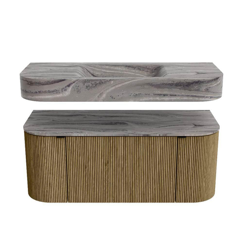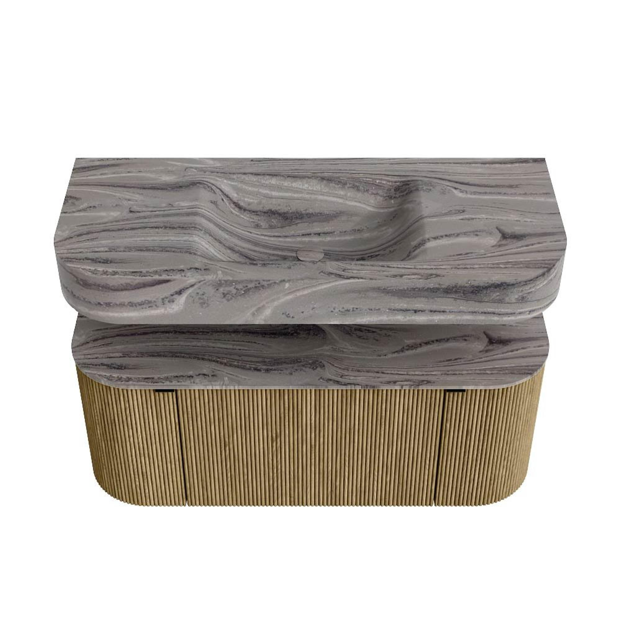 Boven het meubel zweeft een bijpassende, vrij hangende wastafel met afgeronde hoeken – perfect afgestemd op de vorm van de kast. De wastafel is uitgevoerd in Solid Surface en volgt subtiel de lijnen van het onderliggende meubel, waardoor een harmonieus geheel ontstaat. Het Solid Surface topblad vormt een sterke, onderhoudsvriendelijke basis en maakt de combinatie compleet.