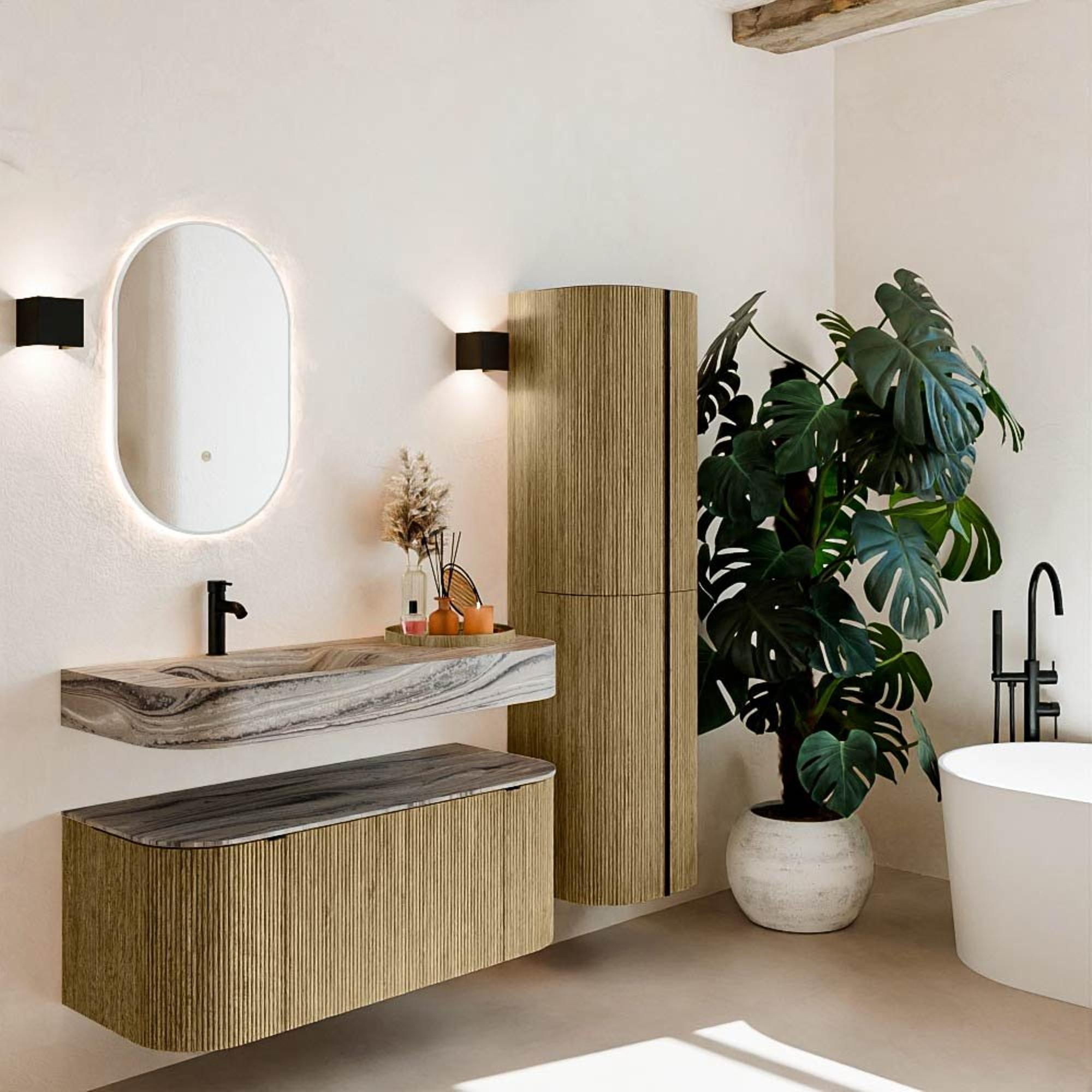 Natuurlijke materialen in warme tinten. De verticale ribbels brengen ritme en textuur in het ontwerp, terwijl het eikenhout zorgt voor een warme, ambachtelijke uitstraling. Kies uit 5 houttinten OAK, WALNUT, DUSK, SHADOW en RUBY zorgvuldig geselecteerde houtkleuren om zowel moderne als klassieke badkamers te verrijken.