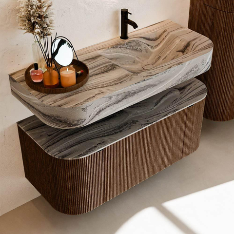 MONDIAZ THOR-DLUX 110cm badmeubel ronding links + rechts kleur Walnut met 1 lade en 2 deuren. Vrijhangende wastafel CLOUD Rechts 1 kraangat kleur Sombra.