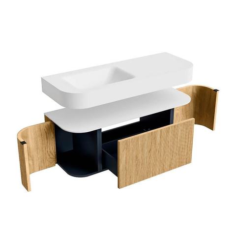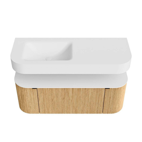 Boven het meubel zweeft een bijpassende, vrij hangende wastafel met afgeronde hoeken – perfect afgestemd op de vorm van de kast. De wastafel is uitgevoerd in Solid Surface en volgt subtiel de lijnen van het onderliggende meubel, waardoor een harmonieus geheel ontstaat. Het Solid Surface topblad vormt een sterke, onderhoudsvriendelijke basis en maakt de combinatie compleet.