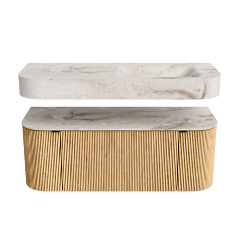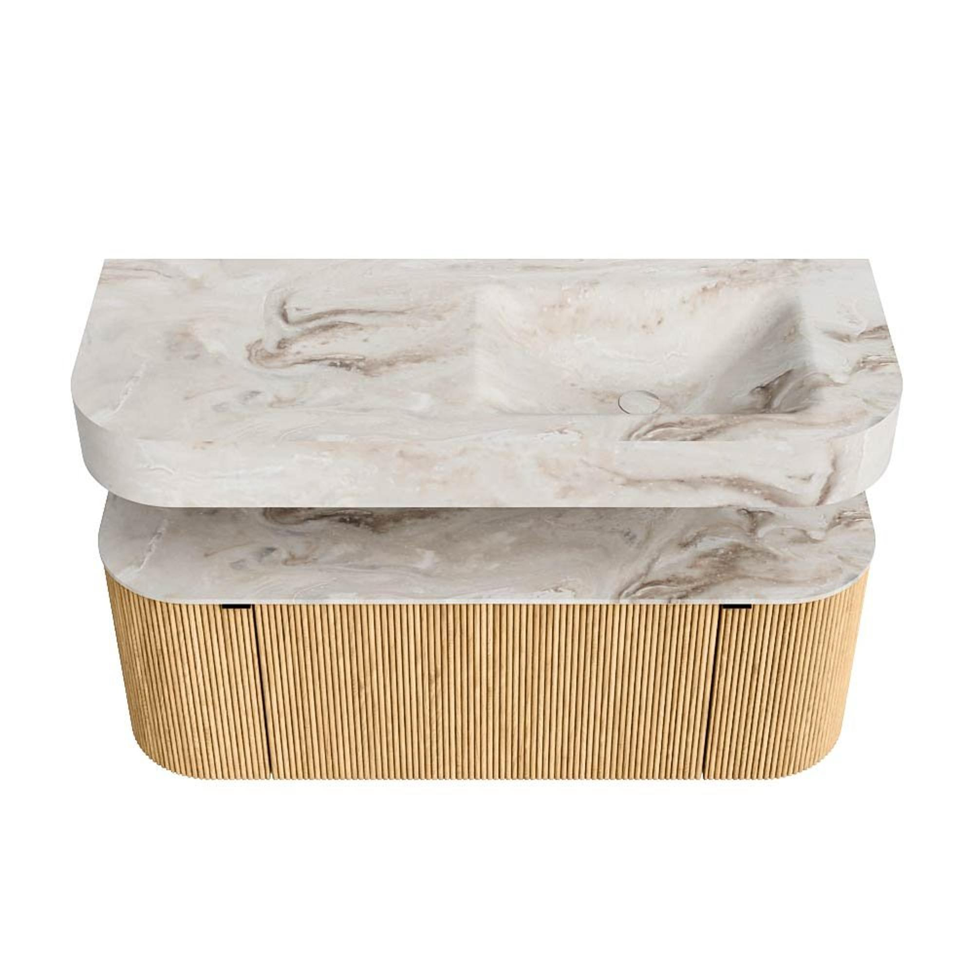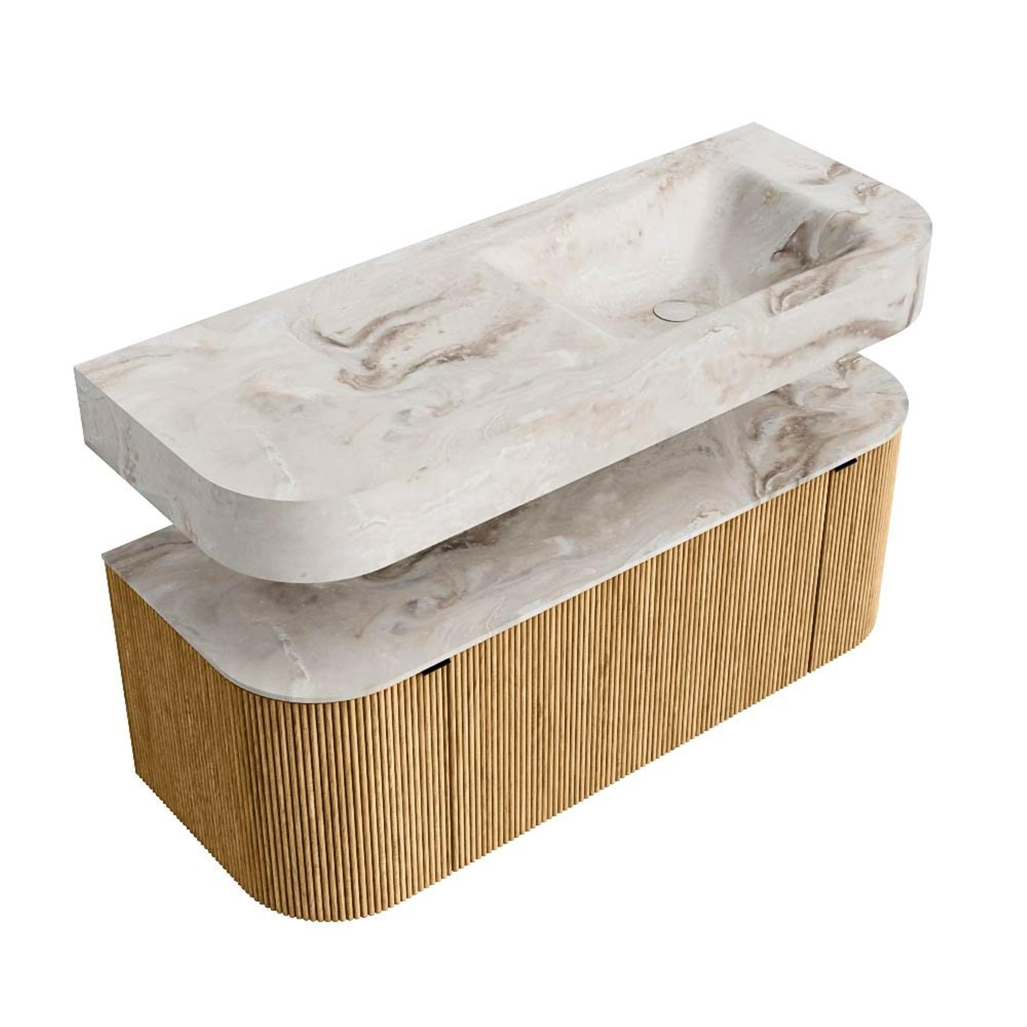 MONDIAZ THOR-DLUX 120cm badmeubel ronding links + rechts kleur Oak met 1 lade en 2 deuren. Vrijhangende wastafel CLOUD Rechts 1 kraangat kleur Frappe.