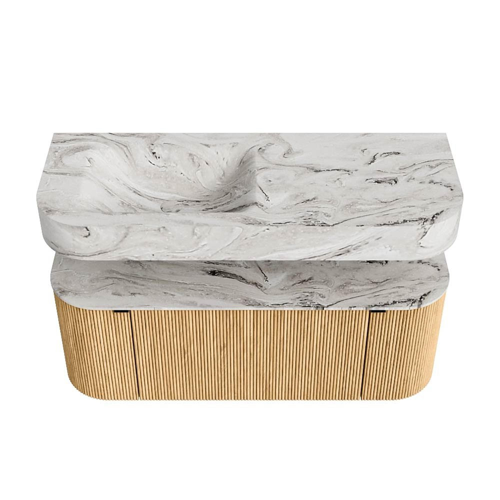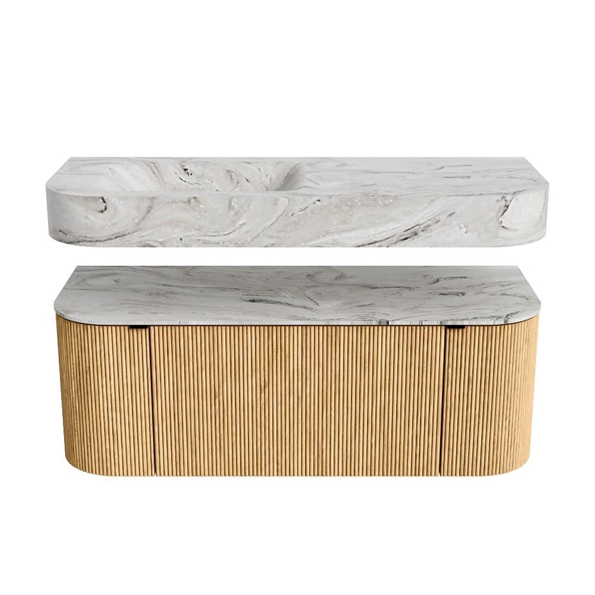 MONDIAZ THOR-DLUX 120cm badmeubel ronding links + rechts kleur Oak met 1 lade en 2 deuren. Vrijhangende wastafel CLOUD Links zonder kraangat kleur Glace.