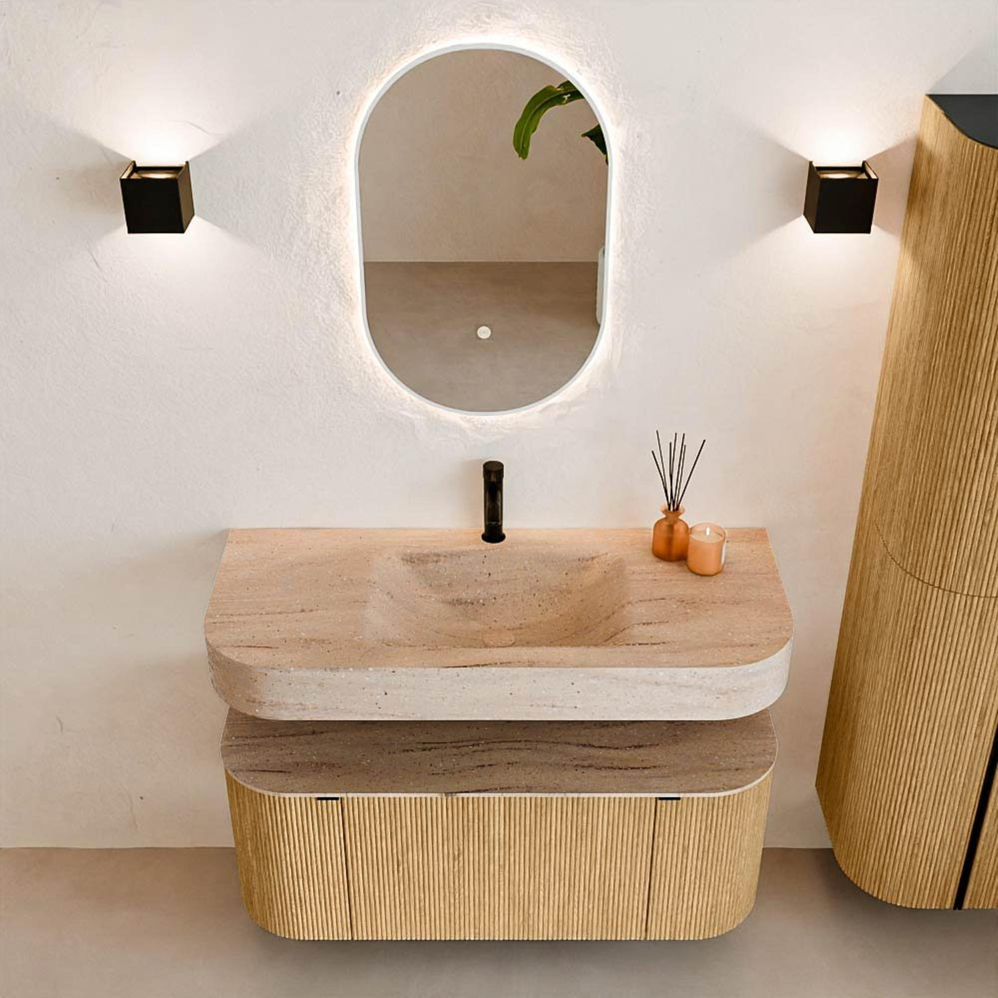Natuurlijke materialen in warme tinten. De verticale ribbels brengen ritme en textuur in het ontwerp, terwijl het eikenhout zorgt voor een warme, ambachtelijke uitstraling. Kies uit 5 houttinten OAK, WALNUT, DUSK, SHADOW en RUBY zorgvuldig geselecteerde houtkleuren om zowel moderne als klassieke badkamers te verrijken.
