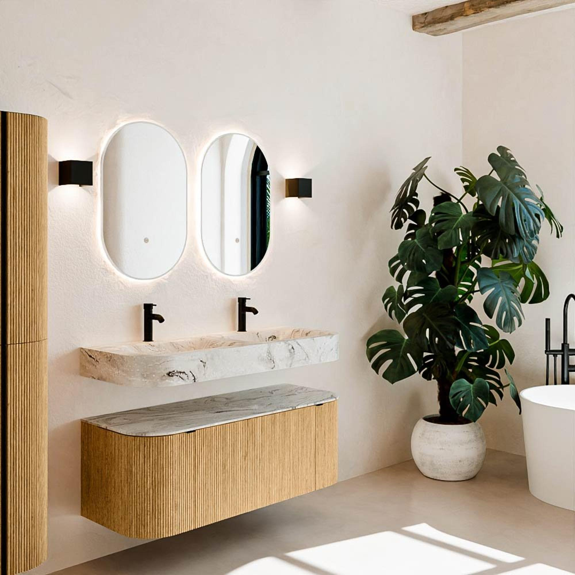 Natuurlijke materialen in warme tinten. De verticale ribbels brengen ritme en textuur in het ontwerp, terwijl het eikenhout zorgt voor een warme, ambachtelijke uitstraling. Kies uit 5 houttinten OAK, WALNUT, DUSK, SHADOW en RUBY zorgvuldig geselecteerde houtkleuren om zowel moderne als klassieke badkamers te verrijken.