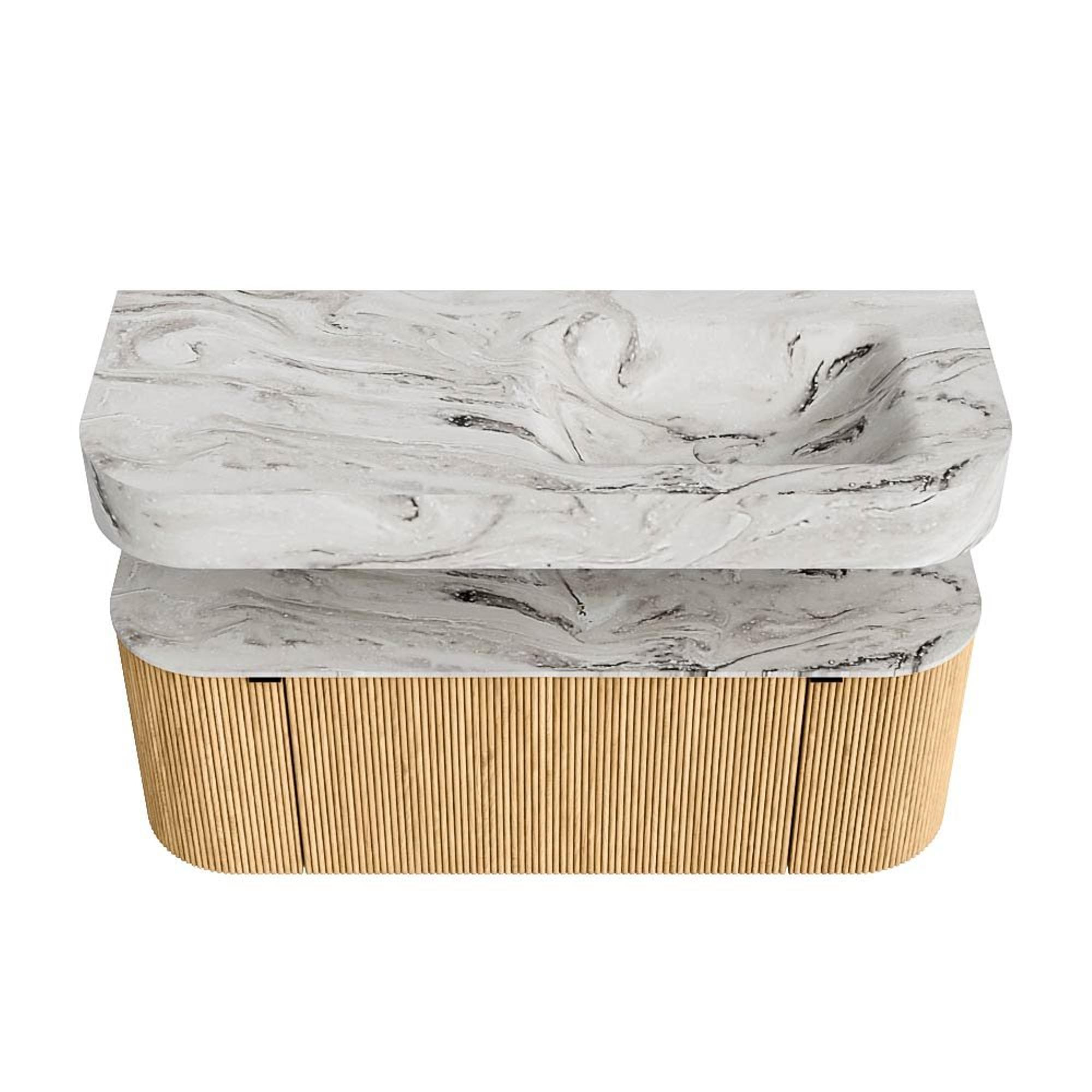 MONDIAZ THOR-DLUX 120cm badmeubel ronding links + rechts kleur Oak met 1 lade en 2 deuren. Vrijhangende wastafel CLOUD Rechts zonder kraangat kleur Glace.