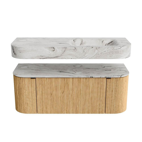 Boven het meubel zweeft een bijpassende, vrij hangende wastafel met afgeronde hoeken – perfect afgestemd op de vorm van de kast. De wastafel is uitgevoerd in Solid Surface en volgt subtiel de lijnen van het onderliggende meubel, waardoor een harmonieus geheel ontstaat. Het Solid Surface topblad vormt een sterke, onderhoudsvriendelijke basis en maakt de combinatie compleet.