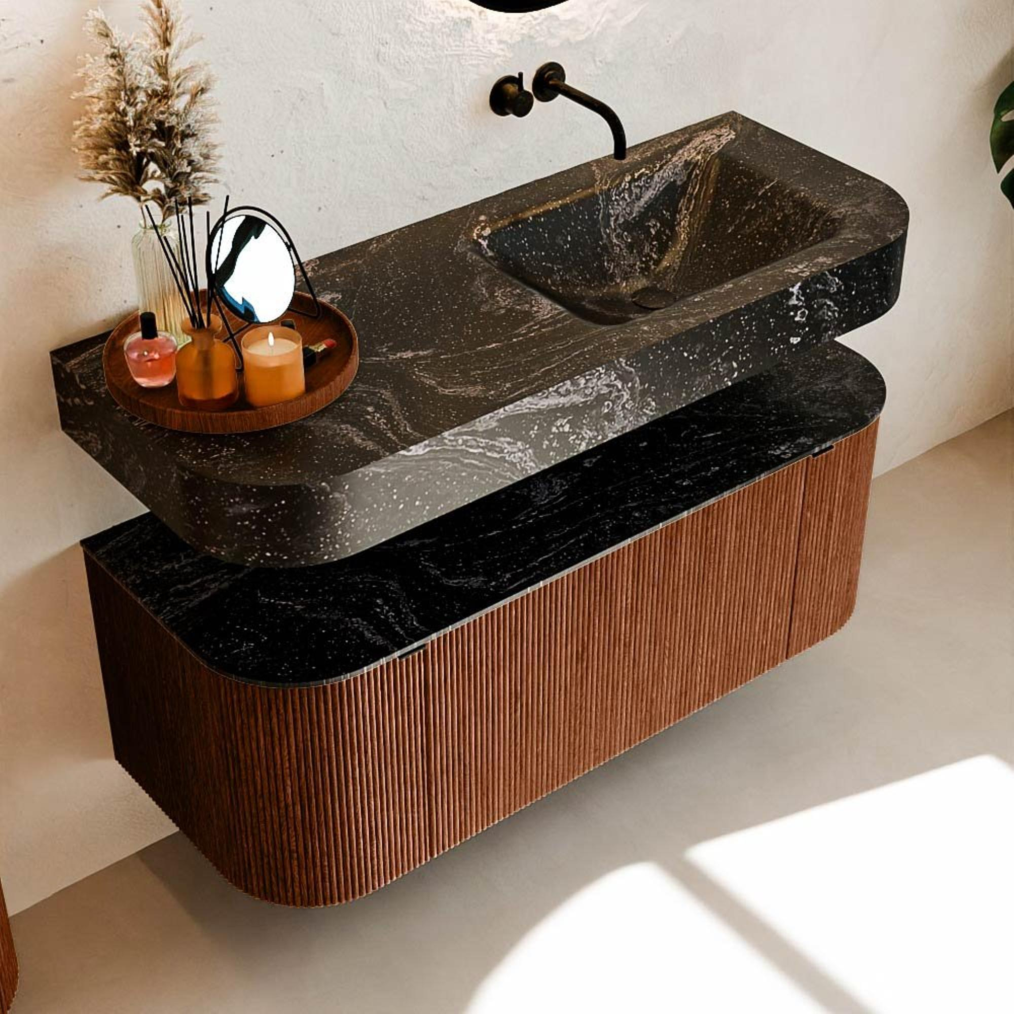 MONDIAZ THOR-DLUX 120cm badmeubel ronding links + rechts kleur Ruby met 1 lade en 2 deuren. Vrijhangende wastafel CLOUD Rechts zonder kraangat kleur Lava.