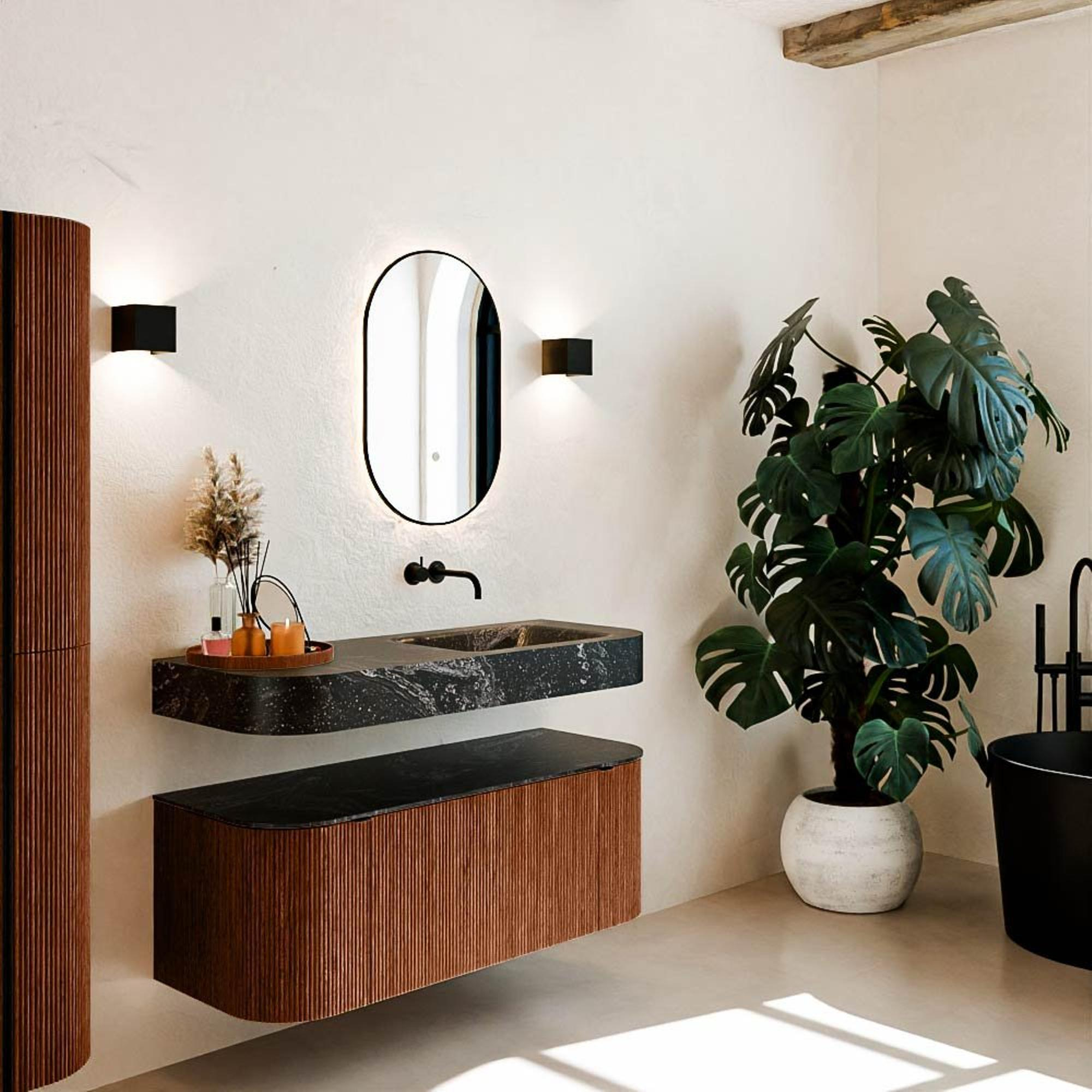 Natuurlijke materialen in warme tinten. De verticale ribbels brengen ritme en textuur in het ontwerp, terwijl het eikenhout zorgt voor een warme, ambachtelijke uitstraling. Kies uit 5 houttinten OAK, WALNUT, DUSK, SHADOW en RUBY zorgvuldig geselecteerde houtkleuren om zowel moderne als klassieke badkamers te verrijken.
