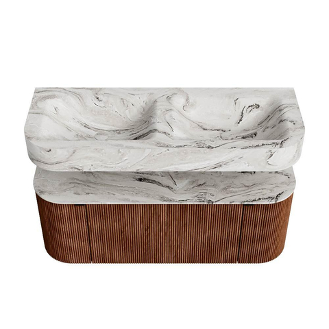 MONDIAZ THOR-DLUX 120cm badmeubel ronding links + rechts kleur Ruby met 1 lade en 2 deuren. Vrijhangende wastafel CLOUD Dubbel 2 kraangaten kleur Glace.
