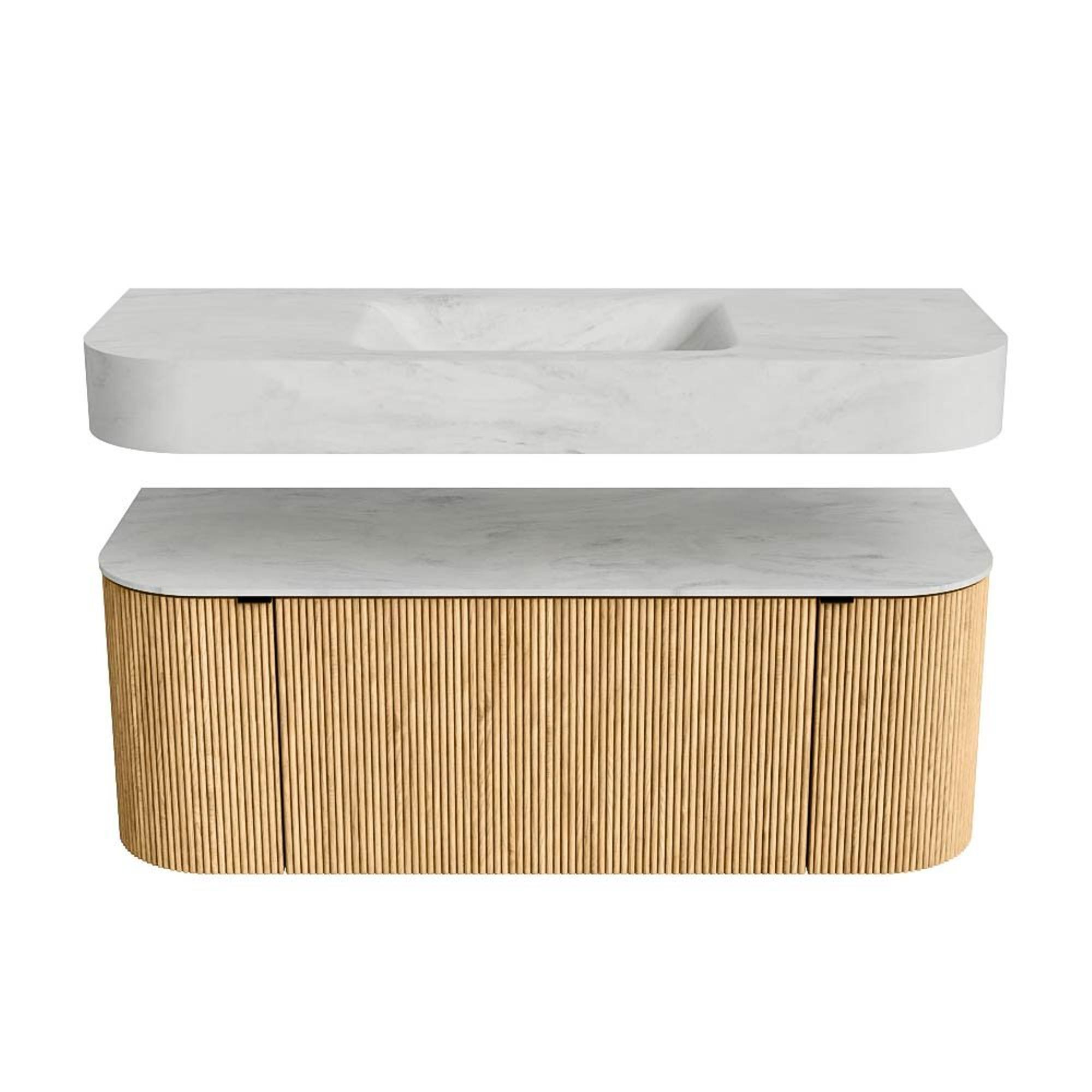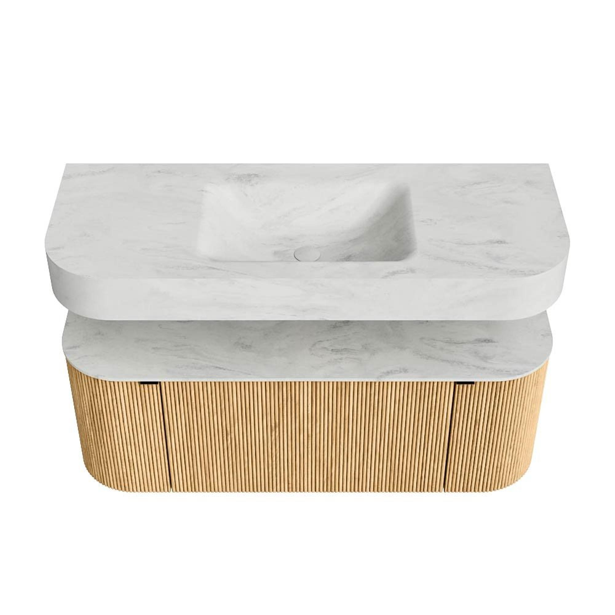 Boven het meubel zweeft een bijpassende, vrij hangende wastafel met afgeronde hoeken – perfect afgestemd op de vorm van de kast. De wastafel is uitgevoerd in Solid Surface en volgt subtiel de lijnen van het onderliggende meubel, waardoor een harmonieus geheel ontstaat. Het Solid Surface topblad vormt een sterke, onderhoudsvriendelijke basis en maakt de combinatie compleet.