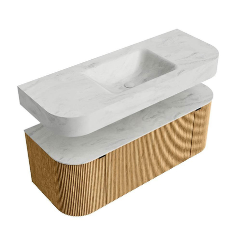 MONDIAZ THOR-DLUX 120cm badmeubel ronding links + rechts kleur Oak met 1 lade en 2 deuren. Vrijhangende wastafel CLOUD Midden 1 kraangat kleur Opalo.
