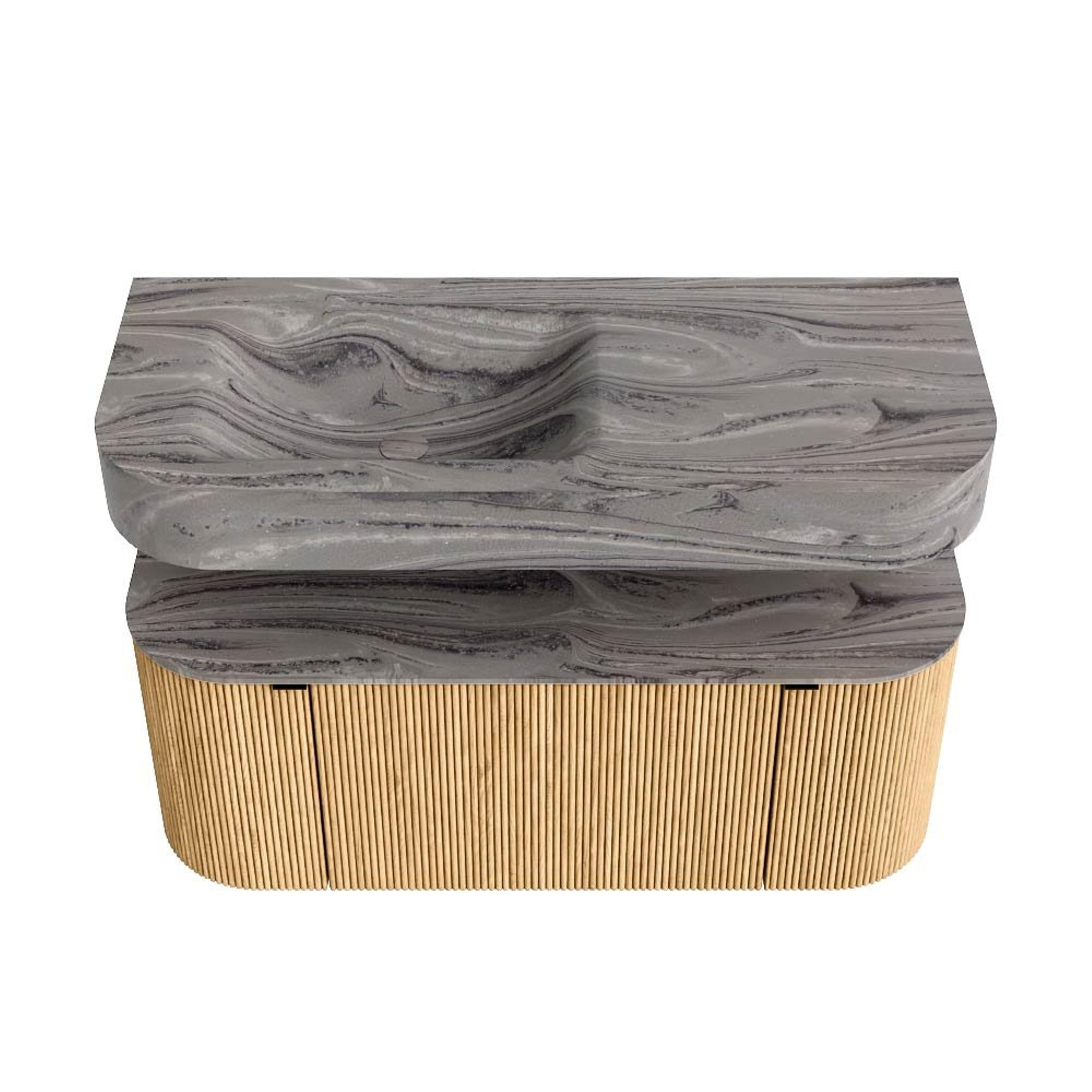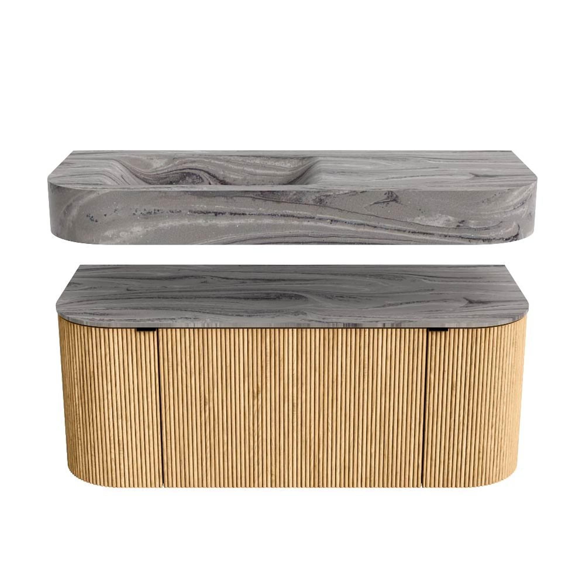 MONDIAZ THOR-DLUX 110cm badmeubel ronding links + rechts kleur Oak met 1 lade en 2 deuren. Vrijhangende wastafel CLOUD Links 1 kraangat kleur Sombra.